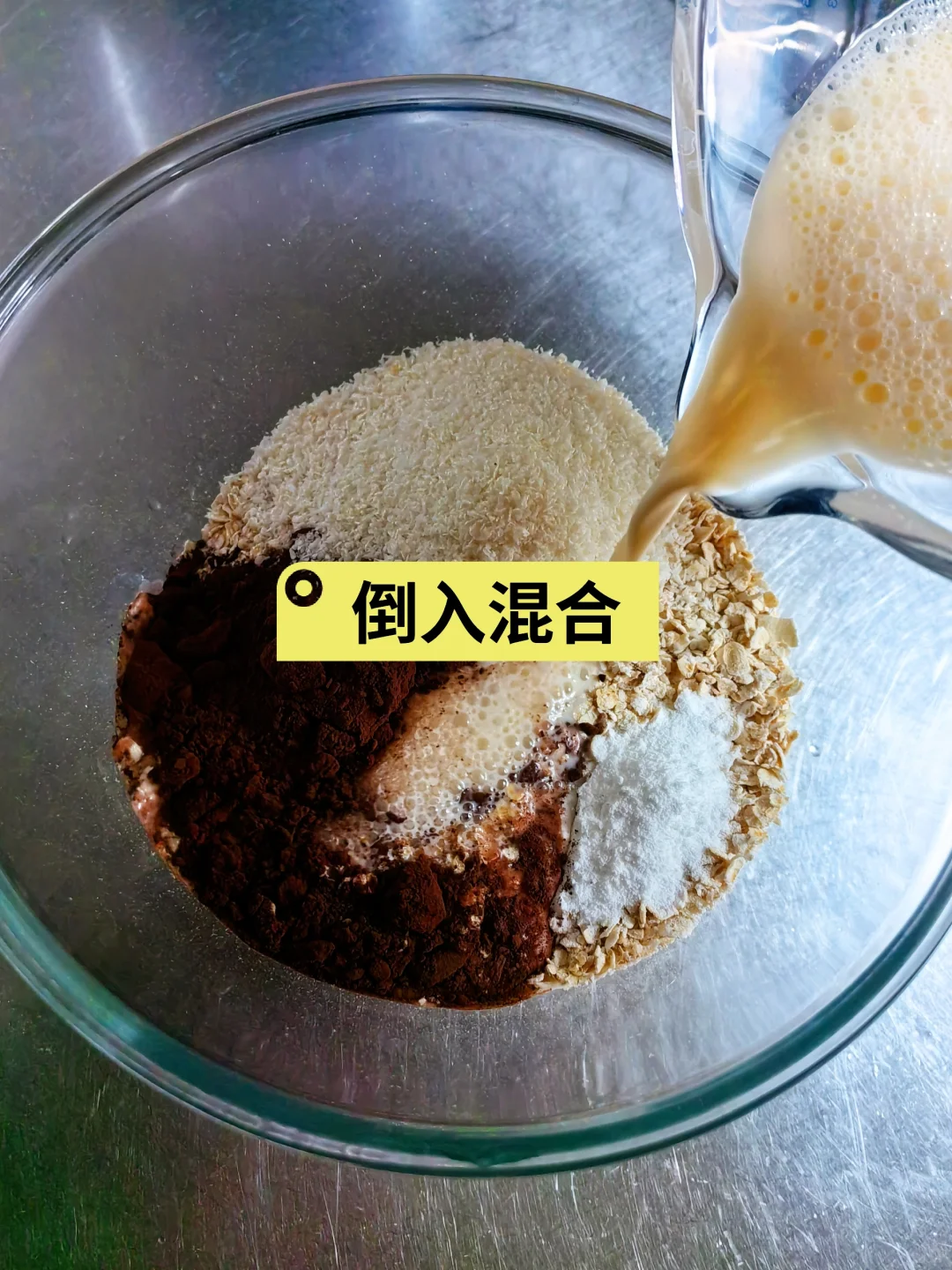 2. 混合燕麦片、可可粉、椰蓉、泡打粉和盐混合。