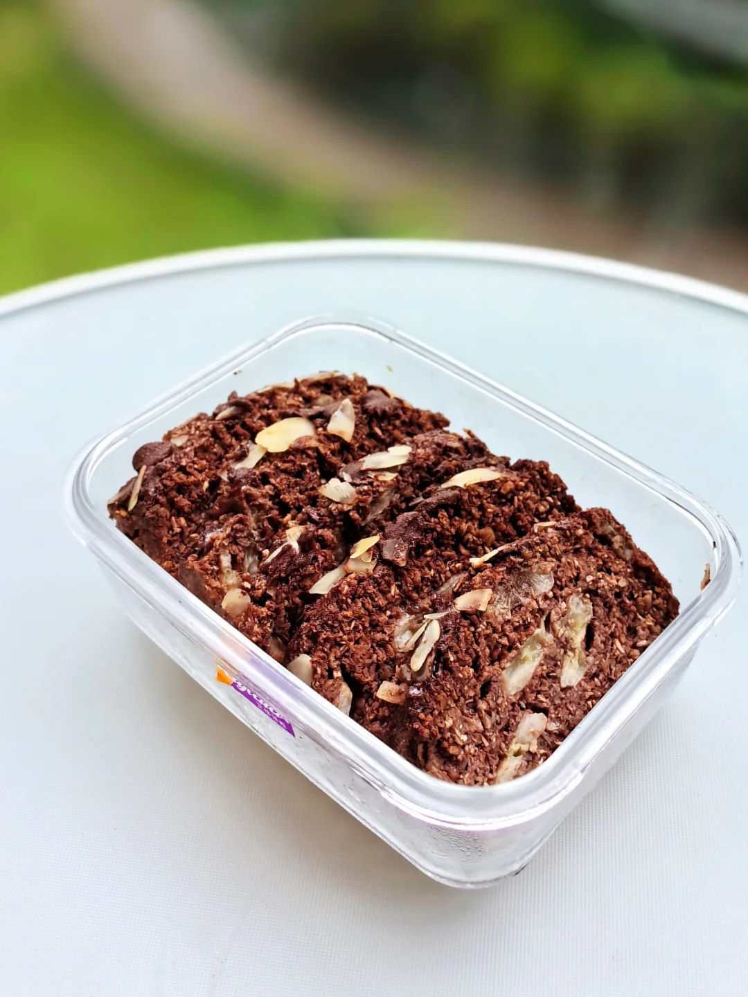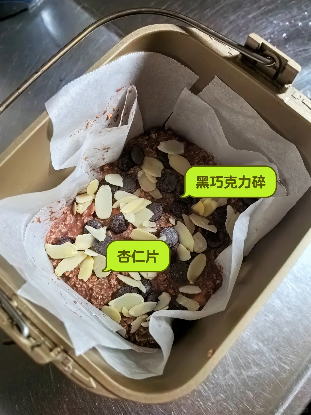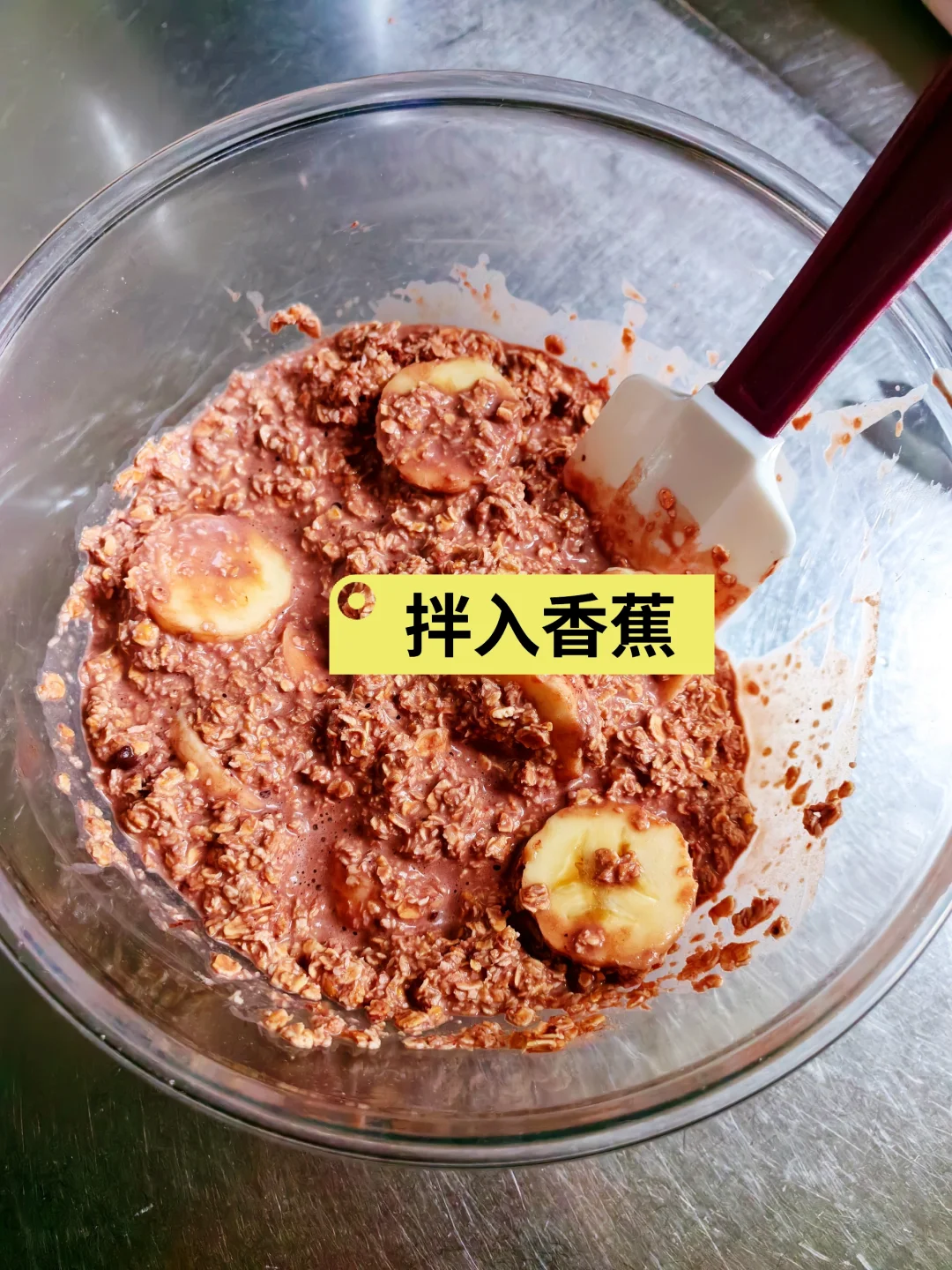 即食燕麦片:120克 | 可可粉:10克 | 泡打粉:5克 | 椰蓉:15克 | 盐:2克 | 鸡蛋:50克 | 牛奶:190克 | 香蕉:100克 | 黑巧克力豆(碎): 15克 | 杏仁片(蛋糕表面):适量