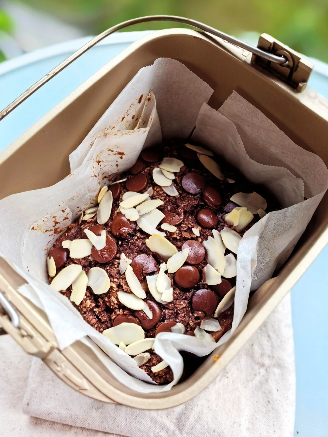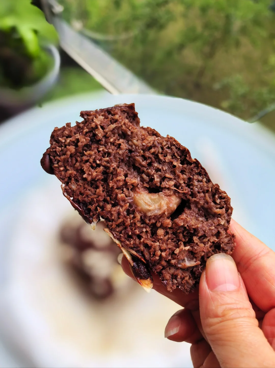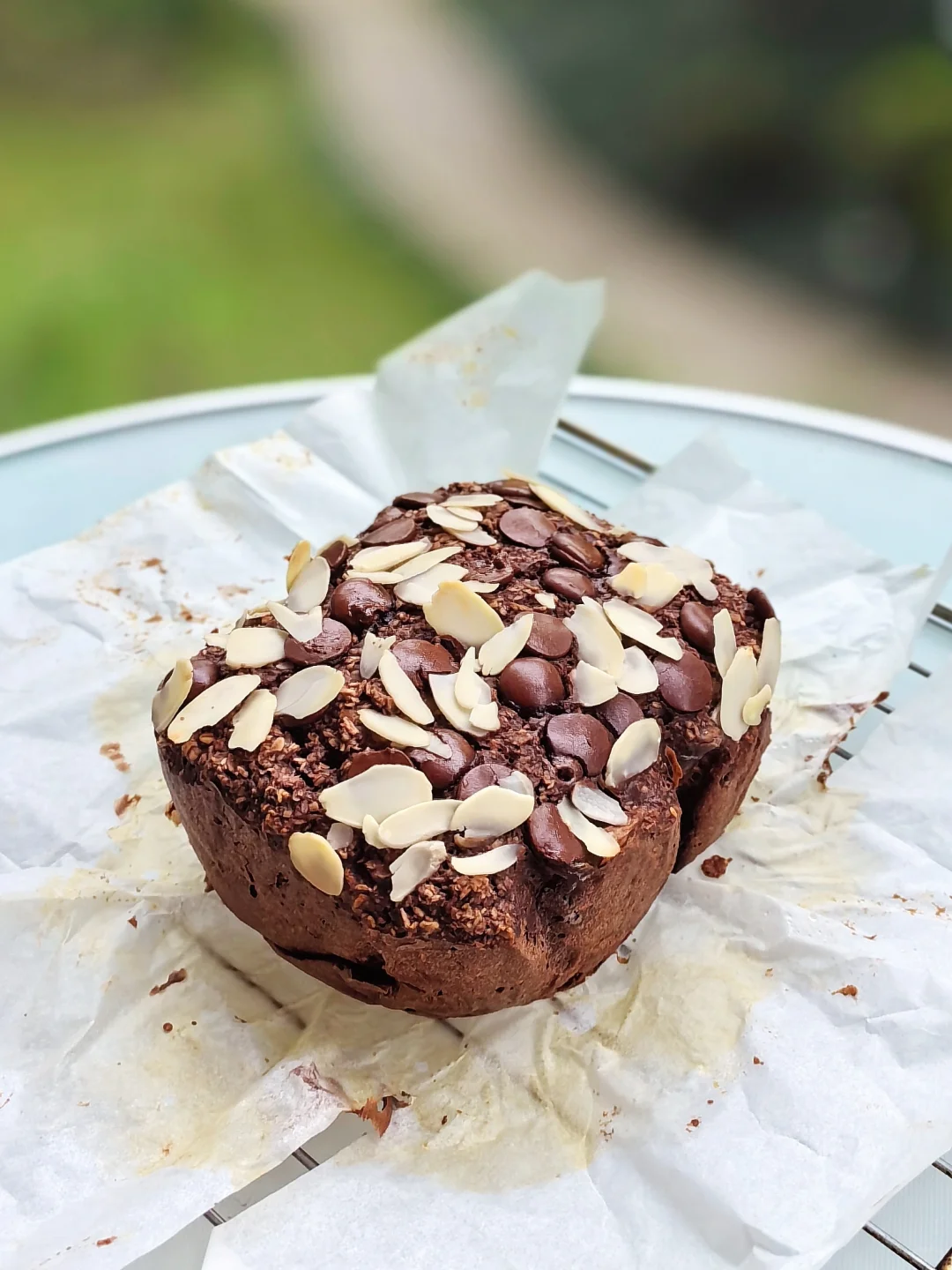 即食燕麦片:120克 | 可可粉:10克 | 泡打粉:5克 | 椰蓉:15克 | 盐:2克 | 鸡蛋:50克 | 牛奶:190克 | 香蕉:100克 | 黑巧克力豆(碎): 15克 | 杏仁片(蛋糕表面):适量
