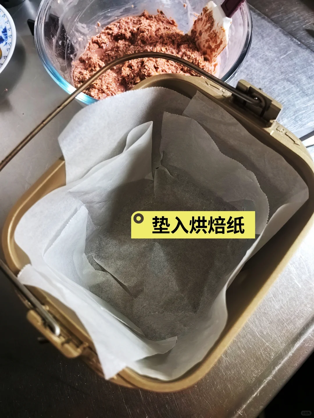 4. 为了取蛋糕方便,取出搅拌片不用,在面包桶内垫上烘焙纸。