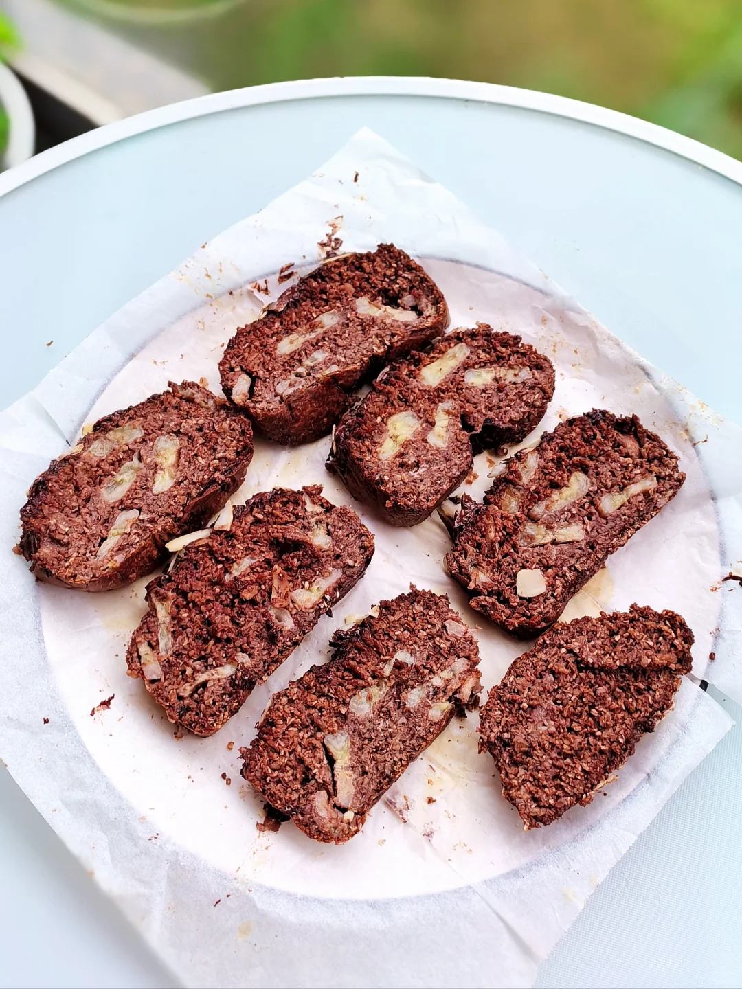 [庆祝R]这款蛋糕的最大特点就是没有面粉,用即食燕麦片来替代,真正做到无糖。很多人控糖的姐妹以为不加糖就可以了,其实面粉才是含糖大户!用香蕉作为甜味剂,用椰蓉、黑巧和杏仁片来丰富口感层次,全都是健康的食物。