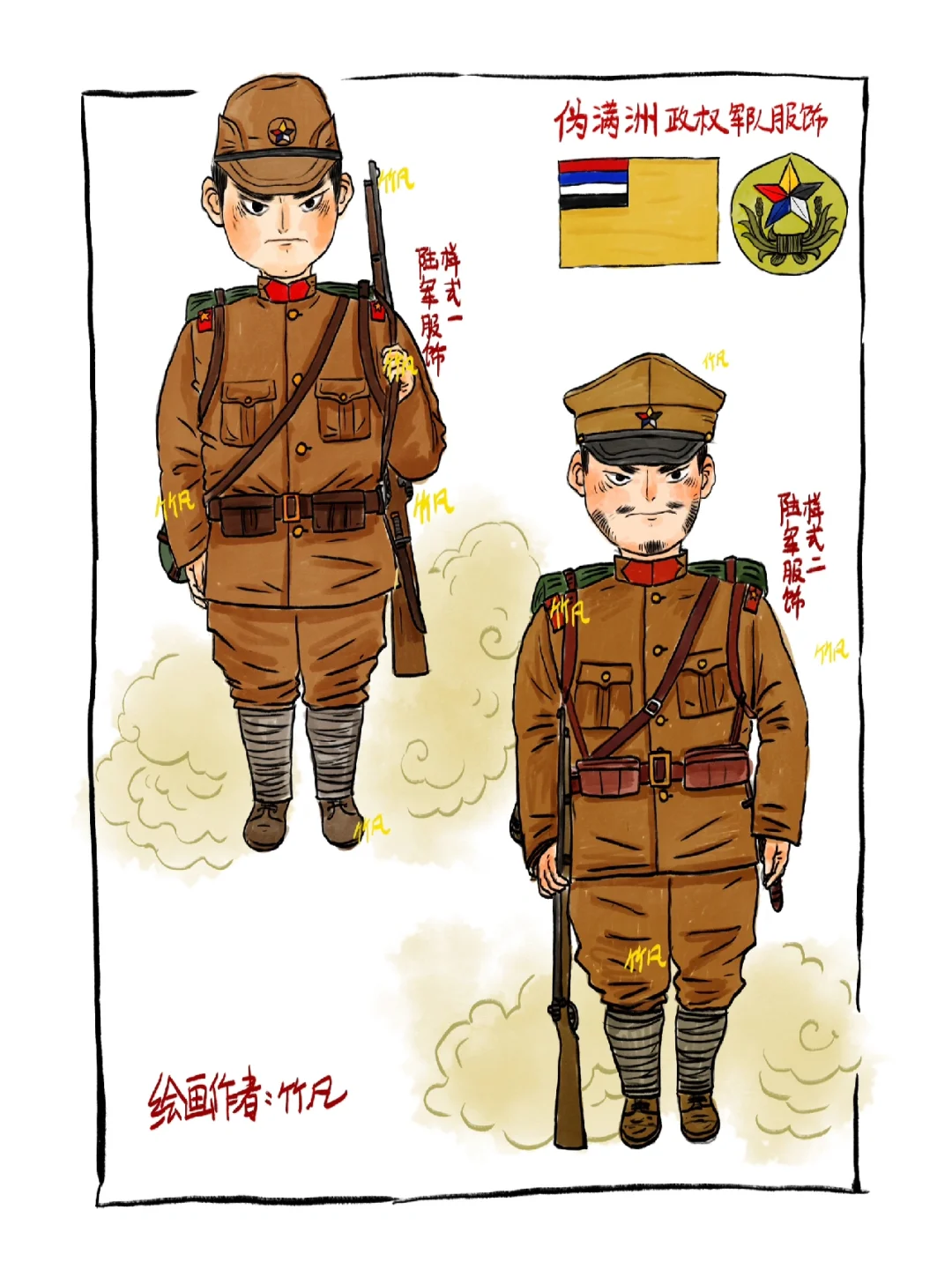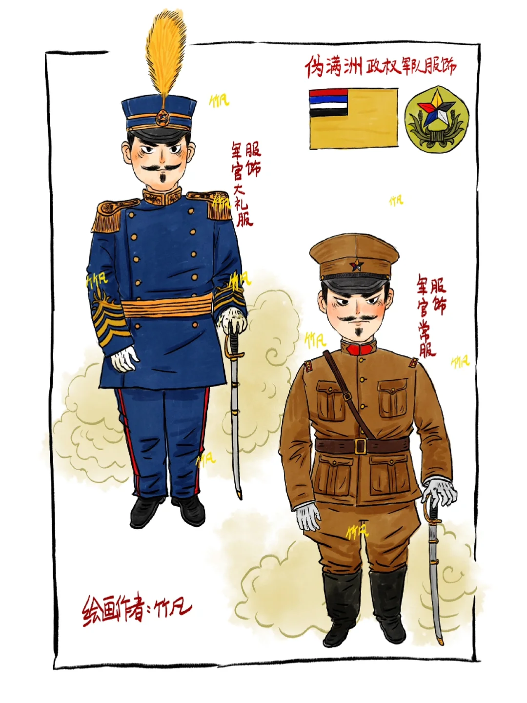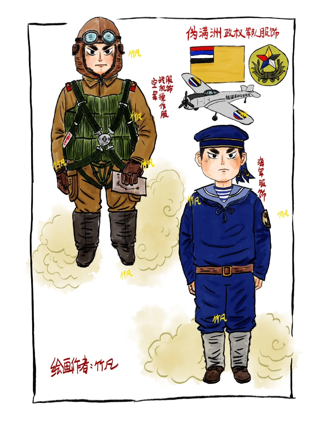 伪满洲政权(1932年3月1日—1945年8月18日),自九一八事变后,日本占领中国东北地区,后续扶植溥仪建立亲日伪满洲政权,整体服饰以日军为蓝本,到了后期服饰更替,基本与日军无异。1945年抗战胜利,日本投降,伪满洲政权也随之瓦解,铭记历史! 整体绘制内容包括基本的海、陆、空服饰,也增加了骑兵、炮兵等图样。伪满空军也是在搜集资料时发现的,其制造及训练都由日本牢牢控制。