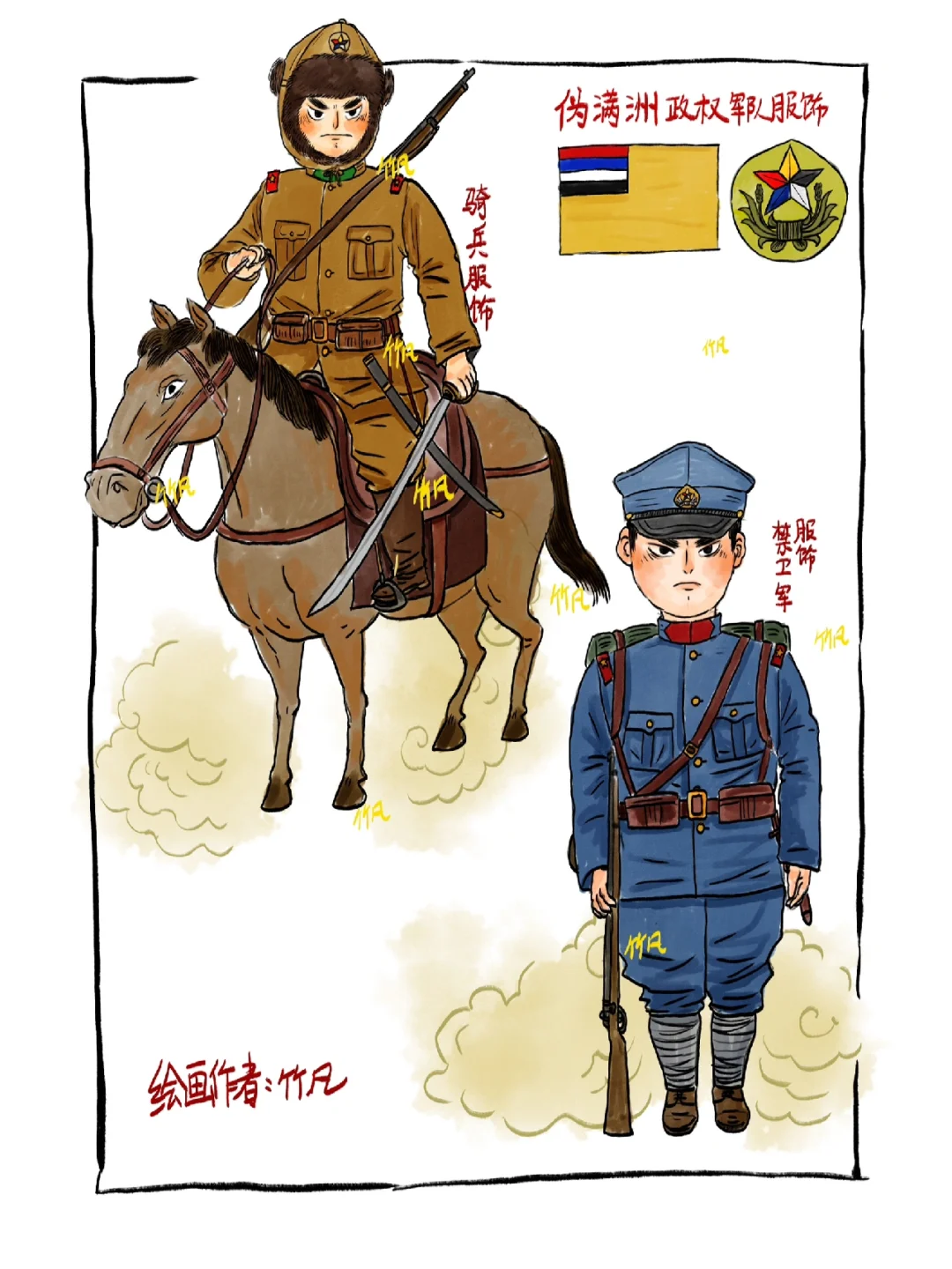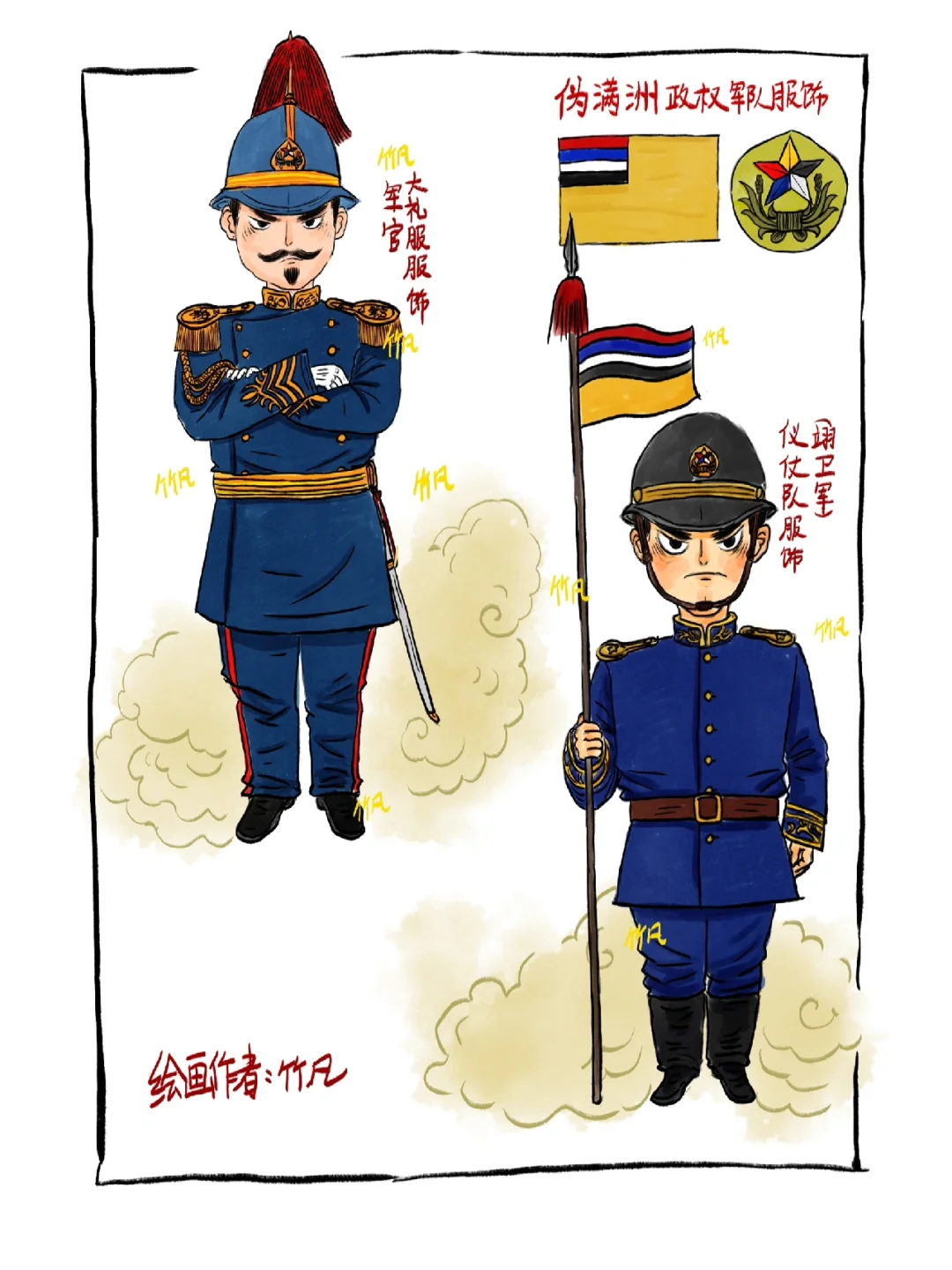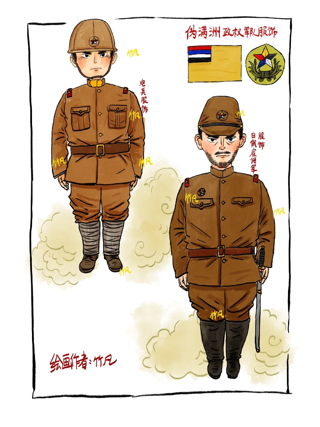 伪满洲政权(1932年3月1日—1945年8月18日),自九一八事变后,日本占领中国东北地区,后续扶植溥仪建立亲日伪满洲政权,整体服饰以日军为蓝本,到了后期服饰更替,基本与日军无异。1945年抗战胜利,日本投降,伪满洲政权也随之瓦解,铭记历史! 整体绘制内容包括基本的海、陆、空服饰,也增加了骑兵、炮兵等图样。伪满空军也是在搜集资料时发现的,其制造及训练都由日本牢牢控制。