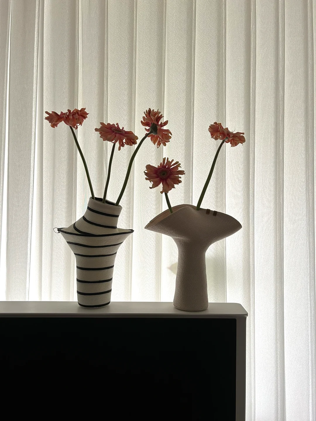 将衣领翻领、立领的形态融入到花瓶中,本身柔软的编织的材质可以任意改变它的造型,演绎出花艺造型的百变姿态