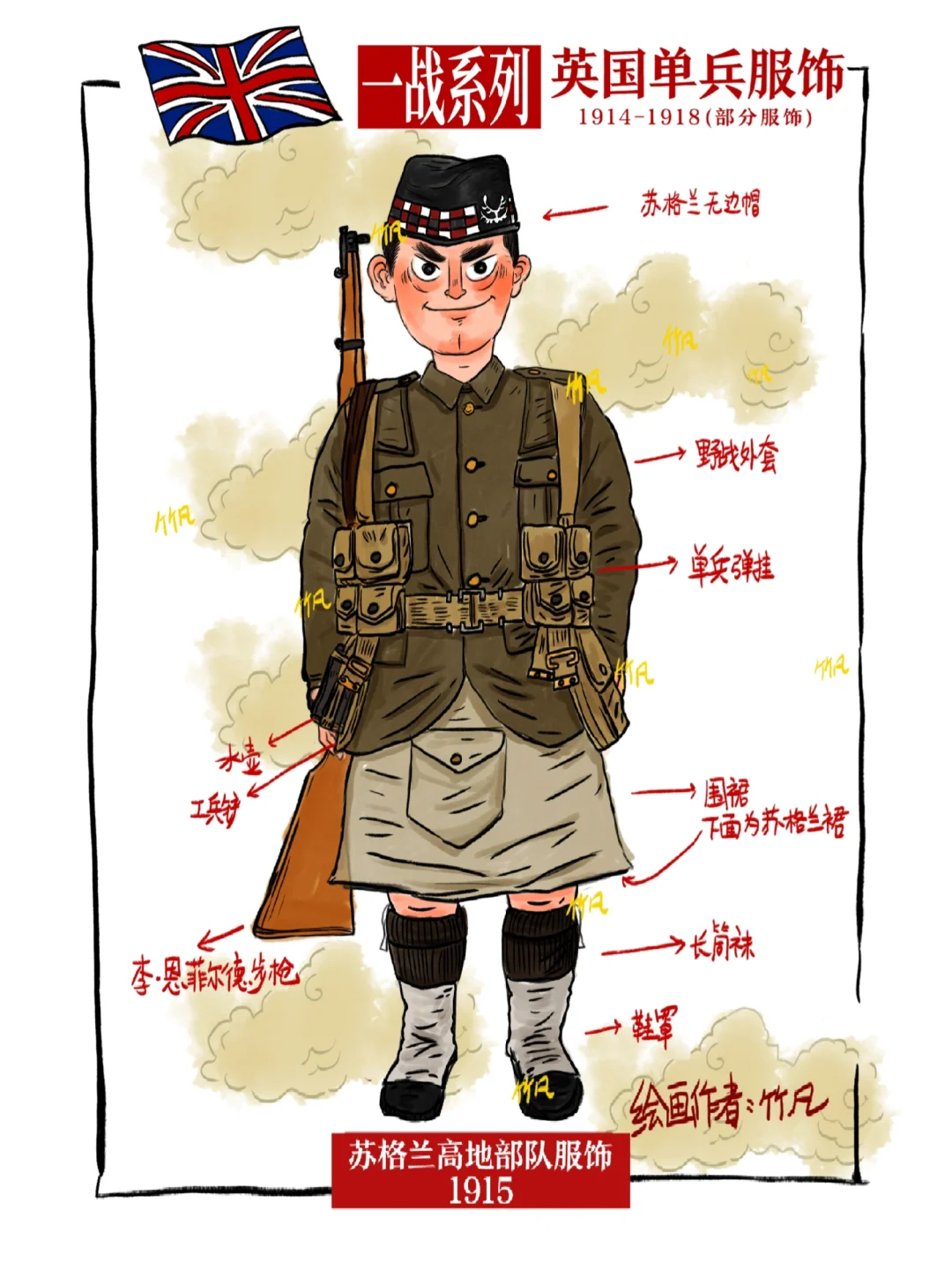 绘制部分比较有代表性的英国单兵服饰,只限于1914-1918单兵内容,苏格兰裙的样式[doge]确实挺奇特,让我想起了小沈阳的小品。