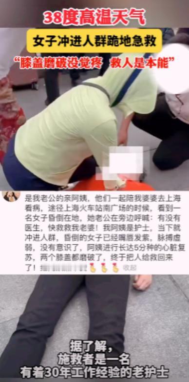 泪目!上海,一位中年男子带着老婆去火车站,可刚走到南广场,老婆突然就倒在地上,没了动静,老公急得跪在地上大喊:救救我老婆!谁是医生?眼看着老婆脸色逐渐发紫,脉搏也越来越虚弱,老公崩溃大哭,就在这时,一名女子挺身而出,随后的举动,感动了在场所有人! 7月8日下午在上海火车站的时候有一对夫妻,妻子突然发生了意外倒地不起,而丈夫一时间蒙了,不知道该怎么办。 丈夫发现妻子的全身都变成青紫色了,但是自己又不会任何的急救知识,只能求着周边的人看谁能救救自己的老婆。 (信息来源:广州日报 2024-07-10《护士顶着高温跪地救援“回家才发现膝盖被磨破了,当时只想着救人。”》) 虽然很多人都被吸引过来,但大多数人都是不会医术的,只能站到旁边看着,没有人能上前帮忙。 丈夫眼睁睁的看着妻子越来越难受,就在他着急的问到救护车怎么还不到的时候,一个穿着防晒衣的女子直接丢下手里的东西,跪在妻子旁边。 后来才知道这位女子名叫龚宜玲,是无锡人民医院体检中心的一名护士,当天她只是陪同亲属来上海看病。 只见龚宜玲仔细检查了一下妻子的情况,随后她将妻子平躺放好,还将头部放到一侧避免呕吐,她熟练地检查患者的颈动脉,发现已经没有搏动。 随后她便开始进行心肺复苏,她双手交叉放在患者胸部,有节奏地用力按压。 而当时的时间正好是中午气温高达38℃,地面温度更高但是龚宜玲并没有考虑那么多,而是直接跪在滚烫的地面上,开始进行抢救。 没过多久龚宜玲的衣服就湿透了,脸上的汗都没有停过,但是她并没有停止手上的动作,因为在她心里想的是怎样才能让患者脱离危险。 周围的人尽管他们不懂专业急救知识,但他们还是想要看看自己能不能帮上什么忙,都自发的想要为他们遮挡一下太阳。 不知不觉龚宜玲已经连续按压了五六分钟,就在这时她发现患者的手脚开始微微抽动,全身的青紫色也逐渐消退。 龚宜玲赶紧再次检查颈动脉,发现已经恢复了搏动,看到妻子终于有了生命迹象,丈夫激动得不停向龚宜玲表示感谢。 但是龚宜玲还是密切关注着患者的情况,直到救护车赶到将人交给了医护人员,她才放松下来瘫坐在地上。 这时人们才看到她的膝盖已经磨破了皮,后来这件事被传到网上后有人问她救人时的感受时,龚宜玲只是说到“在紧急时刻,这都是医务人员的本能”。 她还表示希望更多人学习急救知识,这样在危急关头,都可能会成为救命的东西。 其实这样的事情还有好多,就像在7月5号的时候,一位15岁的少年就在打篮球的时候,用自己所学的急救知识,及时救助了一个快要失去生命体征的男孩。 这些都表明会一些急救知识是很有必要的,对此各位怎么看?[微风]