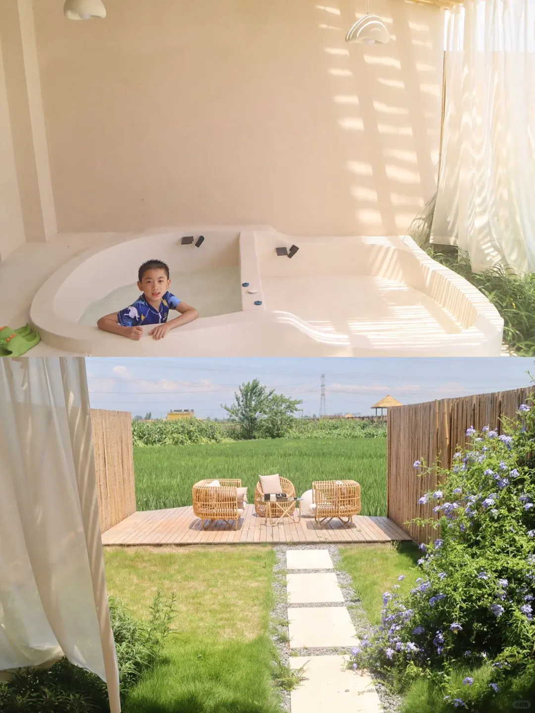 哎呀,这稻田泳池简直是夏日避暑的小确幸嘛!悠哉游哉,亲子时光美翻了~想立刻打包走人!羡慕ing~
