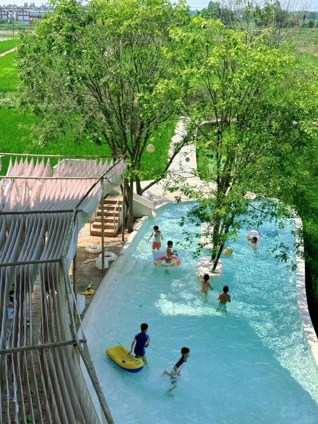 哎呀,这稻田泳池也太适合带娃避暑了吧!夏日懒洋洋,泡在水里,风轻轻吹,这才是生活啊~亲子游绝妙去处,向往中~