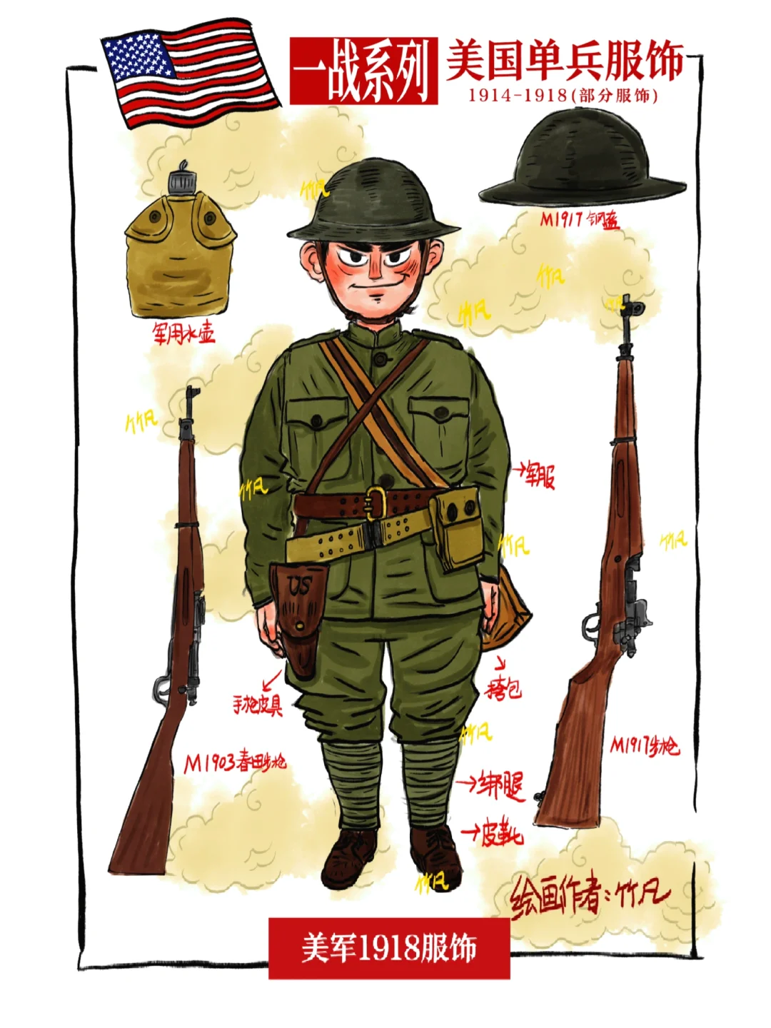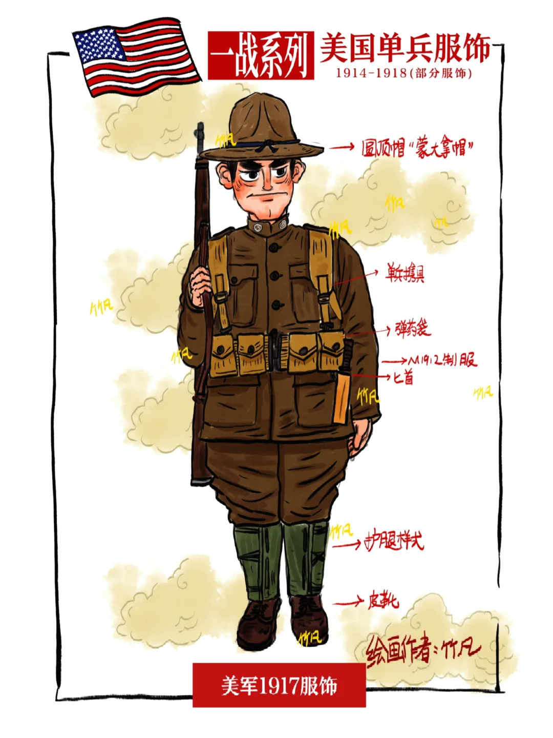 绘制内容为美军一战期间单兵服饰,因参战时间为1917年,和欧洲区交战国比变化非常小,整体服饰基本和英军很像[咖啡R]