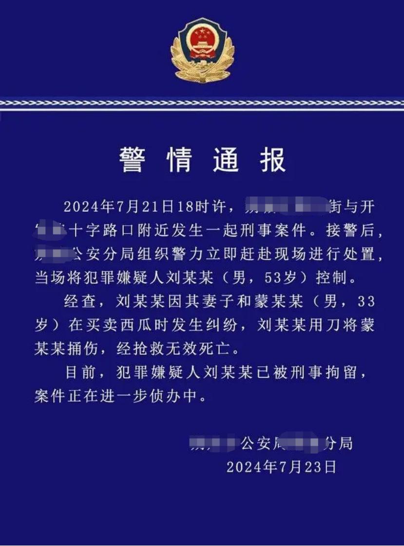 越闹越大!山西一53岁男子看到西瓜商贩和自己的妻子起了争执,一时怒从心头起,抽出车上的西瓜刀,就捅了过去,33岁的西瓜商贩被送去医院,最终抢救无效死亡,而最开始的矛盾则是令人唏嘘。 “杀人了!快报警啊,打急救车电话,快点!”一男子躺在一片血泊之中,周围正在围观的群众们被眼前的一幕吓了一跳,纷纷拿出手机拨打报警以及急救电话。 妻子因为什么事和商贩起了冲突,为何会令人感到唏嘘,而男子目前的情况又是如何呢? (主要信源:鲁中晨报—2024.07.24《53岁男子刀捅33岁男子致其身亡,山西警方通报》) 小蒙是一个卖西瓜的商贩,今年已经三十三岁了,正是为家庭付出奋斗的年纪,谁也没想到,七月二十一日竟然是他最后一次出摊。 刘先生今年已经五十三岁了,眼瞅着就快要退休的年纪,家里的孩子也都长大成人了,不需要他在过多的关注,生活很是悠闲。 二十一号这天傍晚,刘先生和妻子吃完晚饭下楼溜达溜达,正巧妻子刘太太在一个路口碰到了小蒙的西瓜摊,看着西瓜的品相不错,便想着往家买一些。 随后就挑选了一个差不多小点的西瓜,毕竟家里只有她和丈夫两个人,买的太多放不住,西瓜在上秤之后,小蒙说出了一个价格。 但是就是这句话的原因,让刘太太当场和小蒙吵了起来,而在一旁的刘先生听到动静之后,也向妻子走了过来,眼见妻子受了瓜贩子的委屈,当即便怒了起来。 他的眼神定在了小蒙车上的一把西瓜刀上,拿到刀之后,刘先生趁着小蒙与妻子争吵分神之际,以迅雷不及掩耳之势,直接捅了上去,小蒙应声倒地。 在周围群众的描述中,刘太太和小蒙争执的原因竟然是因为三毛钱!不是三十块钱,也不是三块钱,就只是三毛钱。 原来小蒙在看到刘太太选的西瓜称完价格只有三块七毛钱,觉得自己赚的不多的小蒙便自作主张,把刘太太的结账金额变成了四块钱,就是因为这个原因,两人才吵了起来。 刘先生在捅了小蒙之后,便出现了开头的一幕,小蒙躺在血泊里一动不动,而刘先生呆呆地站在一旁好像回过了神,知道了自己干了什么严重的事情。 警察和救护车先后赶到,尽管救护车将小蒙以最快的速度送到了医院,但是小蒙还是因为伤势过重,经过医生奋力抢救,最后还是丢掉了生命。 而刘先生作为犯罪嫌疑人也被当地警方带走调查,直到昨天,当地警方发出关于刘先生故意杀人事件的警情通告,并表示具体情况还在调查中。 原本三毛钱的口头矛盾,变成了一条人命的刑事案件,这件事情在网上引起了轩然大波,网友们对这件事情议论纷纷,大部分的网友认为双方都有责任。 首先是小蒙,作为一个生意人,诚信是最重要的,三块七毛钱的西瓜,优惠的话也是价格往下降的,到了小蒙这里不降反升,搁谁谁都不会乐意的。 而刘先生的问题是太过冲动,本来是鸡毛蒜皮的小事,冲动之下变成了一起命案,或许刘先生在事后也曾后悔自己的做法吧。 因为三毛钱,让两个家庭都遭受了这样无端的灾祸,凡事不要冲动,要冷静理解的沟通,而不是只想着怎样教训对方。