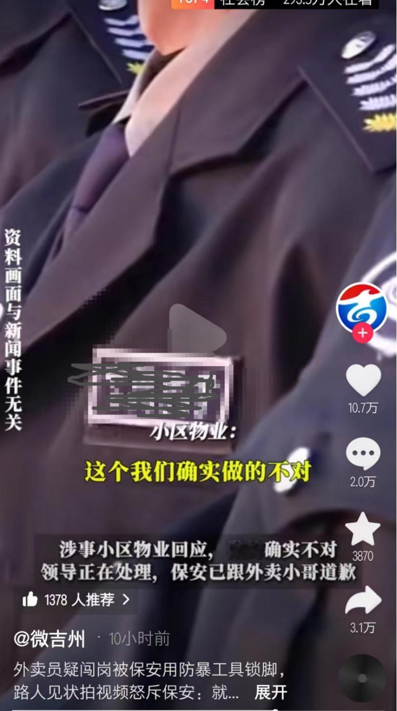 欺人太甚!湖北武汉,一外卖小哥被小区门岗保安拿着防爆工具锁脚,一时间动弹不得,一旁路人见状为小哥鸣不平,怒斥保安:他是一个人!不是牲口!而保安则表示小哥闯岗了,就应该这样,网友:都是打工的,何必相互为难呢? “这不是牲口,这是人,懂了么?”一个小哥愤怒的朝着小区的保安怒吼道,表示一定要为被锁的兄弟鸣不平,而保安却不为所动,就认定了自己锁住的外卖员闯岗了。 闯了小区的门岗,就应该被这样对待么?这其中究竟还有怎样不为人知的隐情,事情最后的发展又是怎样的。 (主要信源:抖音账号—微吉州—2024.07.24《外卖员疑闯岗被保安用防爆工具锁脚,路人见状拍视频怒斥保安:就算闯岗也不能这样对待他....》) 阿强是一个外卖小哥,骑着一辆电动车游走在大街小巷,为顾客跑腿送餐,但是今天他却遇到了一件让人气愤的事情。 某个小区的一名保安竟然拿着一把防爆的工具,将另一名外卖小哥的一只脚踝锁了起来!小哥站在那里一动不动,手里手里不停提示着快要超时的声音 这样毫无人权的行为顿时让阿强有些不悦,他当即上前询问发生了什么事,保安见状一脸严肃的表示,小伙闯岗了。 原来进这个小区的时候,都需要在门口的保安亭处登记一下信息,小哥在来的时候因为订单的原因,硬生生闯了过去,这才有了被锁的一幕。 阿强了解完事情之后,对着保安说到,他不能这样对待啊,小伙不是条狗,是个活生生的人,怎么能这样锁着呢。 但是保安就是一句话,小伙闯岗了,并且说了好几次。 这让阿强的情绪慢慢的急躁了起来,自己处理不了叫警察过来可以吧,随即便让被锁住的小伙赶紧报警,小伙听完阿强的话,表示自己已经报过警了。 阿强表示,自己和小伙只是同行,丝毫不认识,只是见到了这样的事情,阿强有些看不下去了,小伙闯岗,保安拦住就好了呀,这样锁着,完全是将小伙的人权贱踏在地上。 接着便出现了开头的一幕,阿强是实在看不下去了,才朝着保安愤怒的吼道,表示保安可以拦住、挡住小伙,但是不可以这样锁着。 视频一经发出之后,迅速引起了广大网友的热议,认为保安锁人的行为多少存在些不尊重人的意思,而评论的网友们大多也是都是打工人。 他们表示同样都是打工的,何必给同是基层的人们为难呢,相互尊重不好么?但是也有的网友了解到,被锁的小哥是许多次没有在门岗登记信息,保安也是不得已才出此下策。 有的网友觉得保安的做法是在维护小区的安全,如果有不法分子进到小区里面威胁到业主的安全怎么办? 但是评论的风向都是向着被锁的外卖小哥的,评论区也有一些当地的外卖骑手,他们一眼就看出来小伙所在的小区是哪一个,并且表示绝大多数的骑手都非常排斥送到那里的单子。 保安为难人也不是一天两天了,据说这个小区的物业也存在一些问题,在登记身份信息的时候,会要求连身份证号码都要填上,这种行为存在泄露个人信息的风险,也是没有法律依据的。 而在后续,这个小区的物业也在第一时间出面解决此事,表示安保人员的做法有失妥当,并且正在进行处理,在后续会加强工作人员的岗前培训。 并且还表示,当事保安已经和骑手道歉,有网友称这是在他隔壁的小区,最后的结果保安还赔偿了小哥一些误工费。 无论什么冲突,对好的解决办法就是心平气和的交流,彼此给予一定的尊重,这样事情才能得到有效的解决,上述保安的做法是万万不可取的。