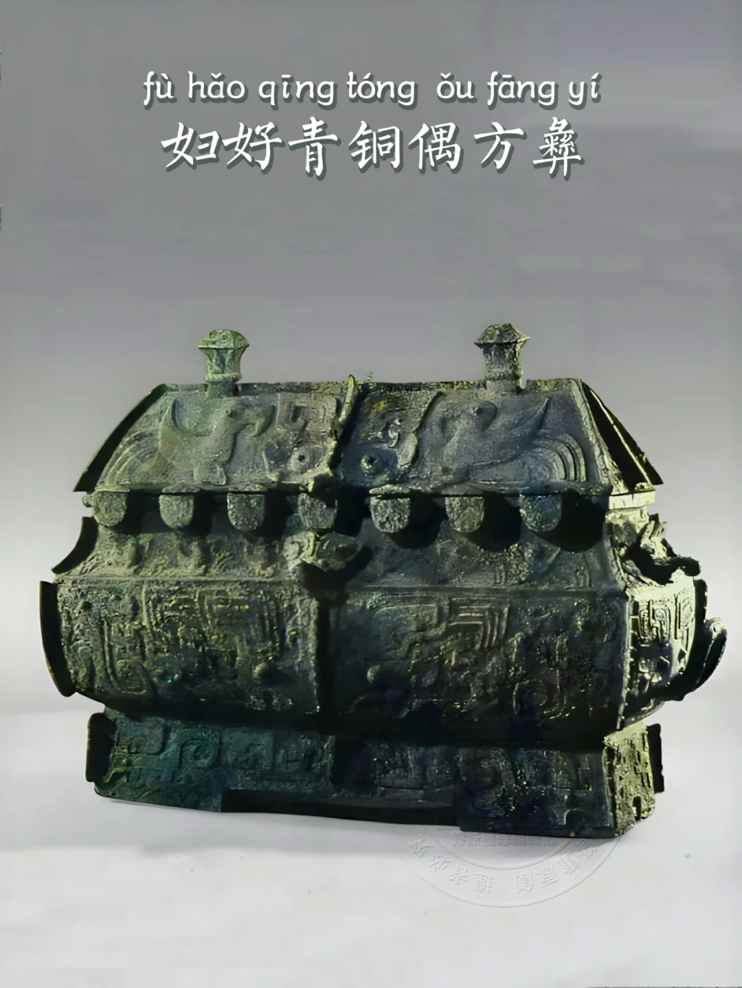 📍彝为盛酒器,流行于商代后期至西周早期,形制通常为纵短横长,有屋顶形盖,方腹或曲壁鼓腹,腹下为圈足。该方彝器型特异,形似两件方彝的联体,故郭沫若先生称之为偶方彝,是商代酒器中绝无仅有的罕见器形。此器身为长方形,口盖如四面坡屋顶。有脊,脊上有两纽,纽亦为四面坡式。器口前后有硬挑式梁头各七枚,前沿为半圆形,后沿为尖形。平底的圈足较高。腹两侧靠下有附耳。自盖至圈足有扉棱六道。盖上饰饕餮纹,两旁加饰鸟纹。口沿下也为鸟纹,鸟纹中间有圆,纹较浅。圈足上饰有夔纹。内底有“妇好”铭文为器主名。