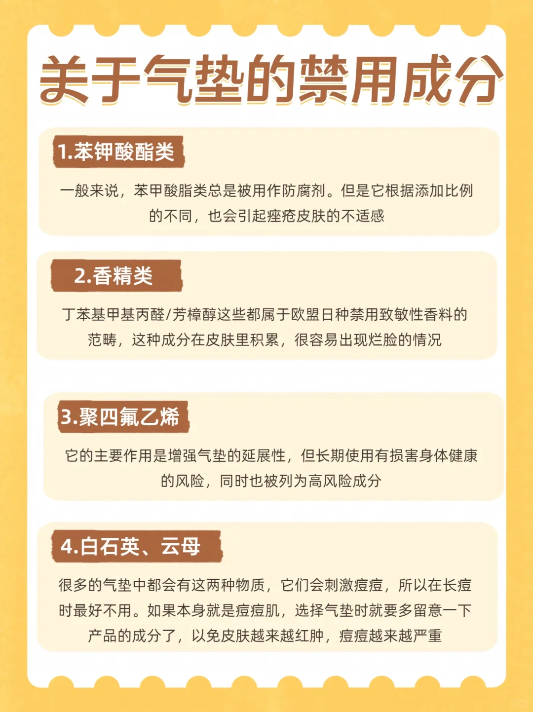 很多的气垫中都会有这两种物质,它们会刺激痘痘,所以在长痘时最好不用。如果本身就是痘痘肌,选择气垫时就要多留意一下产品的成分了,以免皮肤越来越红肿,痘痘越来越严重