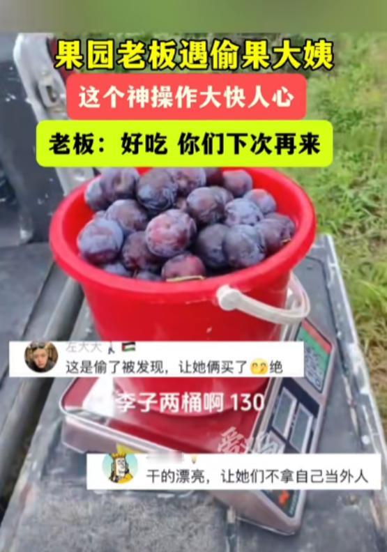 抓贼的最高境界,让贼心甘情愿掏钱!山东济宁,一果园内,两个大妈拿着水桶,在偷摘李子,果园主人发现后,没有火冒三丈的斥责,反而不慌不忙,把称摆出来,伪装成收果的商贩,最终两个大妈反倒给了他130元。网友:这哥们干得漂亮! “李子两桶啊,130!”男子熟练地报出价格,而旁边的两个大姨还在喜笑颜开,没想到自己摘完果子,还能遇到“收果子”的,可是男子接下来的动作让大姨的脸色变了。 男子到底是怎样操作的,竟然让偷果子的大姨“心甘情愿”的掏钱。 (主要信源:抖音账号—爱义乌—《果园老板遇偷果大姨 这个神操作让大快人心 老板:好吃 你们下次再来》) 山东济宁的孔先生有一片自己的果园,种的是李子,眼瞅着丰收的时候就要到了,孔先生也不由得担心起来。 因为果园的位置周围有一个村庄,孔先生在网上少看村里喜欢占便宜的老人中年人,到别人的家的果园去偷偷摘人家的果子,盗取别人的劳动成果。 孔先生也是担心这样的事情,毕竟都是现实生活中的真事,果子没结的时候倒无所谓,眼瞅着满树的李子,孔先生有事没事便骑着车来果园转一圈。 正巧这天,村里的两个大姨前几天看到孔先生的果园果子熟了,便相约来到这里悄悄地摘点带回去,没想到正巧被孔先生抓了个正着。 孔先生这天也是照例来果园巡视,还没到果园门口,便看到果园路边停了两辆电动车,孔先生心想不好,怕啥来啥,估计是附近村民来这“零元购”呢。 孔先生看过之前的案例,最后的处理方法不是报警就是偷盗的人撒泼打滚,这也让他有些头疼。 突然他想起了车子上还放着一台电子秤,这让他心中顿时有了主意,便把车开到了果园的门口,静静地等待着里面两位大姨的“战果”。 不一会,两个大姨一人拎了一桶李子出现在孔先生的视野,脸上满是“丰收”的喜悦,有说有笑的走了出来,或许是看到了孔先生车上的称,以为是收果的,便没在意。 孔先生当即叫住了大姨,表示自己的收果的,她们手里的自己可以收,大姨一听还有这好事?出门“捡”李子,还能碰到人收果,笑着便答应了孔先生。 接着便出现了开头的一幕,孔先生称罢,便在身上找着什么,大姨一看,以为是孔先生准备付钱,便也拿出手机,正准备询问某付宝还是某信。 不料孔先生先一步把付款码拿了出来,大姨点开手机一抬头,眼神里有那么一瞬的疑惑,随即便明白了过来,原来自己“捡”果子的这个果园是人家的。 自知有错在先,脸色有些不太正常的大姨拿着手机便把钱扫了过去,心情就和过山车一样,从刚开始的开心,变成现在这样尴尬的沉默不语。 临走前,孔先生还在表示到,好吃的话让大姨们下次再来,视频一经在网上发布之后,顿时引来了网友们的围观。 网友们在看完之后,在评论区笑的前俯后仰的,表示大姨没想到收李子的,先拿出了付款码;“大姨:还来?还咋来啊。” 也有的网友给孔大哥点赞,他这样的做法既挽回了损失,还没点破大姨的偷盗行为,还给大姨留了面子。 其实生活中,像大姨这样的人有很多,秉着有便宜不占王X蛋的想法,趁主人不在的时候,满足自己“不花钱的采购”,被发现后撒泼打滚,耍无赖。 但是像大姨这样的人也不多,在知道自己犯错的情况下,给台阶就下,见好就收,这样也是事情双方最好的处理方式。