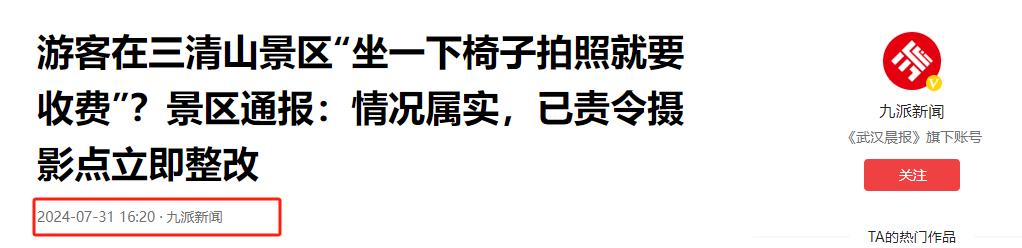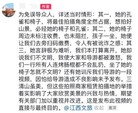 “拍山还要收费?”江西一女子在景区拍山,被大姐拦住说要收费,理由是拍到了她的孔雀,可女子表示自己只是在拍山,根本就没想拍你的孔雀,收费大姐直接说到:"你让我赚钱就没这么多事了"! 这世界已经颠成这样了吗?拍个山也要收费,当时林女士(化名)和自己的朋友一行人去江西的三清山游玩,让他们没想到的是这里拍个山还要收费。 本来一行人带着美美的心情上山,准备好好放松一下心情,看到美丽的风景林女士忍不住掏出手机,想要拍点照片发朋友圈。 (信息来源:九派新闻 2024-07-31《游客在二清山景区"坐一下椅子拍照就要收费”?景区通报:情况属实,已责令摄影点立即整改》) 让人没想到的是一个中年妇女突然出现在了镜头前,用手挡住镜头,说拍照要收费,每张5元,这可把林女士一行人给整蒙了。 这还是第一次听说自己拍山要收费,林女士也问出了自己的疑惑,没想到大姐说这是自己养的孔雀,如果要拍照的话就得先交钱。 林女士这时候明白了,随后她跟大姐说自己不拍孔雀,只拍后面的风景,说着便往旁边挪了挪,避免镜头里出现孔雀。 没想到这大姐直接挡在前面说不能拍,拍了就得给钱,林女士气炸了,说自己照山不照孔雀也不行吗? 大姐直接说到大家都是要赚钱的,你们想拍照就要掏钱,这时候林女士就给她吵了起来,说自己没有拦着不让大姐赚钱。 这位大姐直接说到“你就让我赚点钱怎么了,你舍得花钱你就拍,你不舍得花钱就不要拍”。 大姐的做法简直惊呆周边的人,而且坐大姐的椅子也是要收费的,当时有个小朋友,看到大姐旁边有把椅子,便坐上去了几分钟,谁知道大姐直接让小朋友的家长扫二维码付款。 其实有的地方是会有拍照收费的服务,但是大部分都是有人扮成人偶,很多人看到这种情况,第一反应都知道她是收费的,有的人会买单,有的人则认为没必要。 但是拍风景收费的基本上是不存在的,反正小编去过很多地方,这是第一次听说这种情况。 后来林女士一行人不想给这样的人一般见识,就准备离开,没想着这大姐直接说他们没有素质。 这就搞不懂了,不拍照不在她那花钱就是没素质了,林女士说他们吃个烤肠的签子,因为没有垃圾桶就会拿一路也不乱扔,现在却被人说没素质,简直就是可笑。 林女士表示将这个视频发出来,是因为想要相关部门重视起来,有些地方拍照的时候可以收费,但有些地方这样的行为只会给游客带来不好的体验。 后来三清山景区有发布公告,说已经对违规的地方进行整改,并且向所有的游客进行道歉,但是这样轻飘飘的行为,并没有让大家买账。 网友们纷纷表示这样的景点以后肯定不会去,还有人表示现在外面到处都是收费的,只有家里最好,与其将钱送给他们,还不如在家吃吃喝喝,好好对待自己呢。 对于这样的事情各位有什么看法呢?
