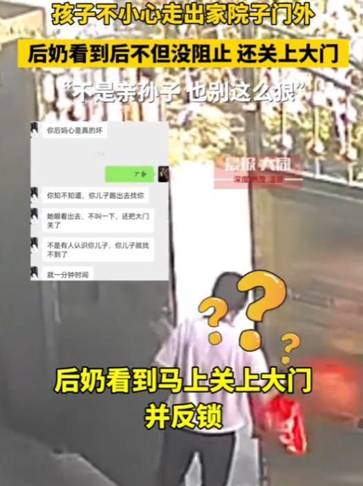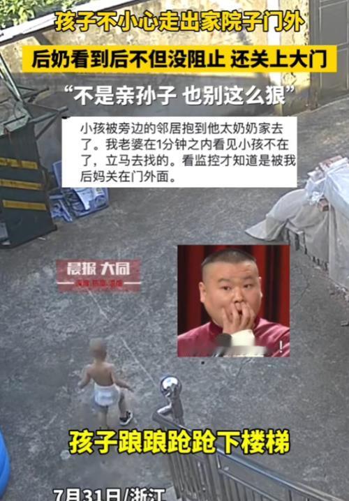 “如此歹毒!”浙江绍兴,孙子独自走出院门,后奶紧随其后,故意将孙子关在门外,孩子父亲出来找不到孩子,查看监控后怒砸大门!网友:不是亲奶奶也别对孩子太狠! 这人是一点心也没有呀,在林先生(化名)小的时候,就想要将林先生丢掉,不过没有成功,现在能竟然光明正大的,把林先生的孩子锁在门外。 林先生小的时候妈妈因为生病去世了,从小就没了妈妈的照顾,林先生开始变得懂事了起来,后来爸爸又娶了个女人回家。 (信息来源:椒点视频 2024-08-01 《孙子跑出门后奶反手锁门,亲爸知道后怒砸大门:不是亲孙也别太狠》) 就像大多数后妈一样,这个女人根本就看不惯林先生,甚至想要将林先生赶出家门,好在林先生当时还有奶奶护着,才没让这个女人得逞。 从那以后林先生就跟后妈的关系很不好,基本上可以说是互相看不惯,但是没办法彻底的撕破脸皮,毕竟在一个屋檐下,抬头不见低头见的,只能将各自的不满压在心里。 后来林先生长大后有了自己的家庭,她们就住在同一个院子里,林先生一家住在二楼,而爸爸和后妈住在一楼,平常没有什么事情也基本上不会有交集。 后来林先生有了自己的孩子,他和妻子因为是第一次当父母,都很小心翼翼地生怕不能照顾好孩子。 好不容易孩子会走路了,小两口觉得可以喘口气了,没想到的是因为后妈的小心思,导致孩子差点走丢。 当时林先生有事外出,妻子在家里忙里忙外的,一个不注意小家伙就从房门里溜出来,自己一点一点的下了楼梯。 到了一楼的时候,林先生的后妈就在院子里,但她也没有关心孙子这是要干嘛,而是站在那里眼睁睁的看着孩子自己出了大门。 这还不是最过分的,没想到这个后妈接下来的举动,能够让人惊掉下巴,她竟然在孩子出门后二话不说的将门给关上,并且从里边给锁上。 后来林先生的妻子发现孩子不见了后,疯了一样的四处寻找,就在出门在路上寻找的时候,发现村里一个人抱着自己的孩子,往他家送。 这个人说看到孩子一个人在路上,就准备给他送回家,后来林女士看了家里的监控,看到事情的经过后,没给她气死。 她很自责自己的疏忽,但是更多的是对林先生后妈感到生气,她把这件事告诉林先生后,林先生回到家直接拿着锤子,对着大门的锁狠狠的砸去。 没想到的是林先生的爸爸看到后,竟然还不分青红皂白地为后妈说话,简直就是糊涂了。 网友纷纷表示这女人是有多恶毒,不是自己的亲孙子就可以眼睁睁的看着孩子走丢,你可以不喜欢,当不能这样的狠心。 还有网友提醒林先生一定要注提防这个女人,说不定以后会做出更加过分的事情。 对于这样的事情各位有什么看法呢?