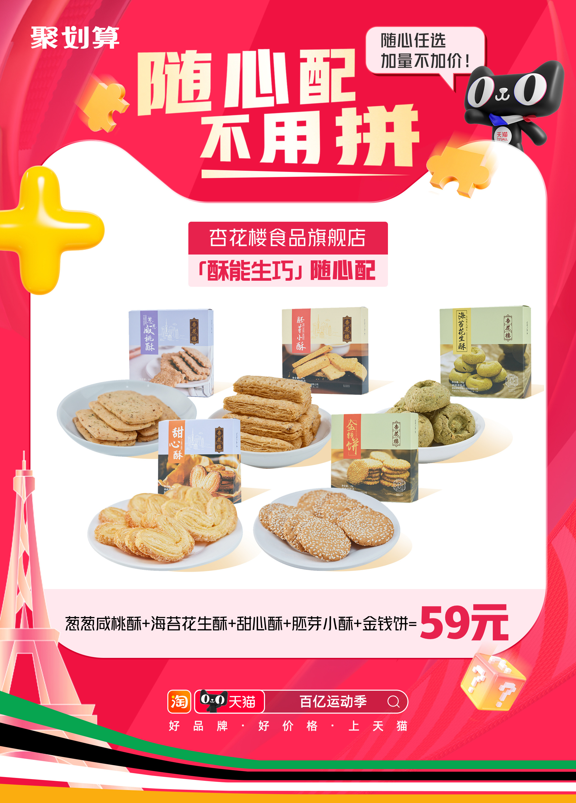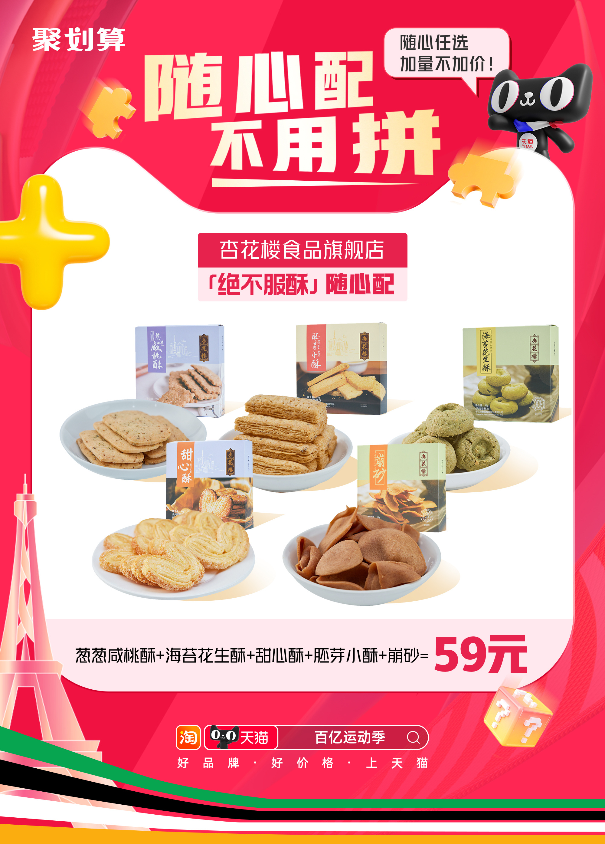 今天全办公室的人都在讨论聚划算随心配,一口价加量不加价,还可以自己搭配喜欢的好物组合,比如说“酥能生巧”随心配,里面有各种我喜欢吃的小点心,#淘宝百亿补贴热血一夏#8月6日-8月7日,上淘宝搜索【百亿运动季】,加持观赛氛围,快来一起拿捏~#这夏被88VIP包圆了#