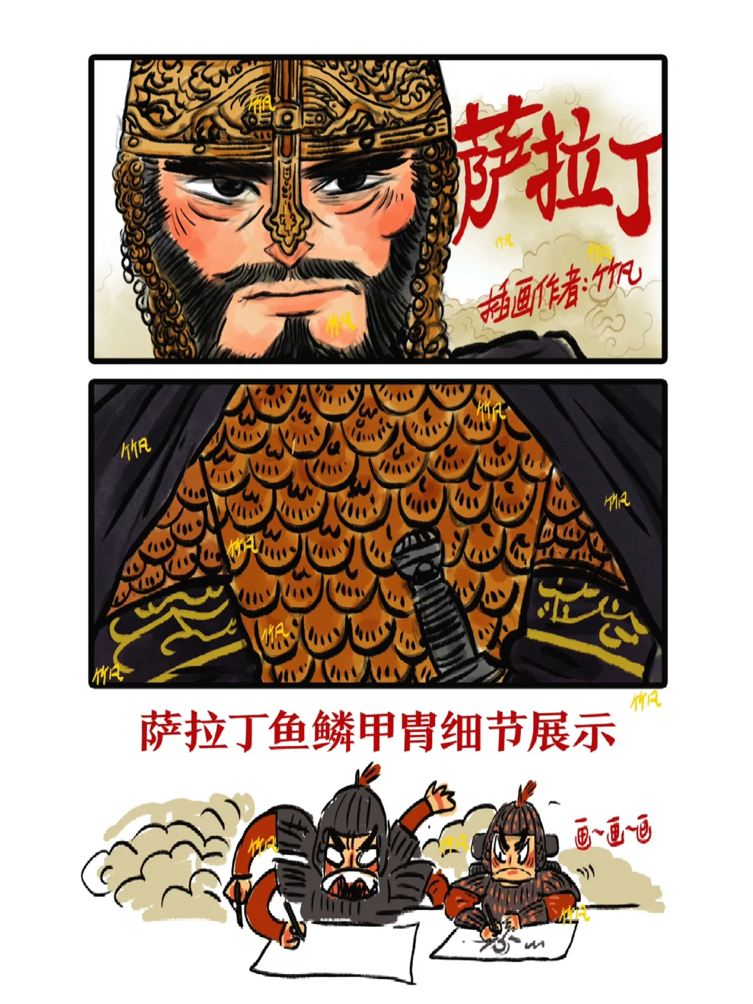 绘制铠甲参考以电影《天国王朝》萨拉丁形象为参考,绘制其鱼鳞甲样式,头部护耳及颈部为锁子甲,整体铠甲样式奢华,浮雕华丽,样式魁梧