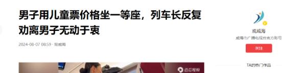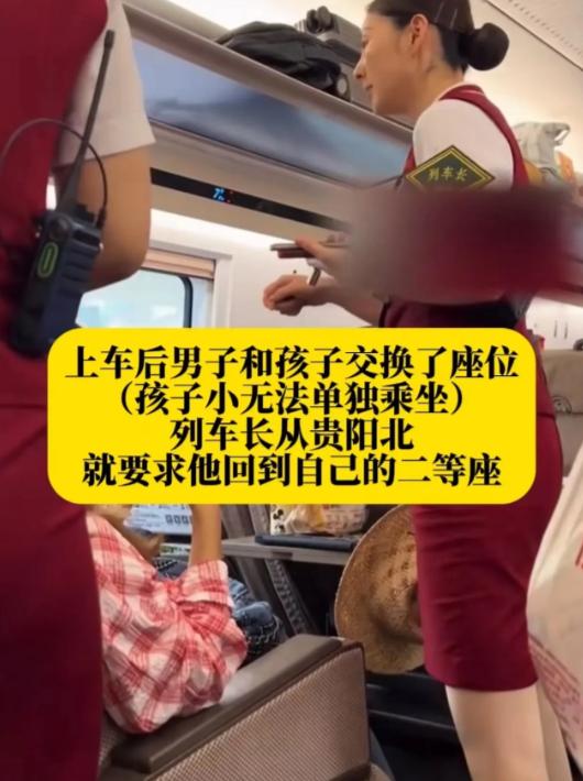 男子用儿童票价格坐一等座,列车长反复劝离男子无动于衷!而网友却支持男子!拍摄者:“他们一家三口出行,夫妻俩买的是二等座票。由于二等座卖光了,就给孩子买了一等座儿童票!孩子不能一个人坐,男子就坐了孩子的一等座,坐了20多分钟,到下一站才离开。” “我不就是跟我儿子换了一下座位吗,为什么会有这么多的事呢?”林先生对着列车员不解的说道。 而列车员则表示,林先生要不现在就和孩子将座位换回来,要不就是将差价补齐,不然他的做法已经违反了相关规定。 (信息来源:观威海2024-08-07 《男子用儿童票价格坐一等座,列车长反复劝离男子无动于衷》) 原来8月5号的时候林先生准备带着妻子和孩子出门游玩,当时他和妻子买了两个高铁的二等座,后来准备给儿子买的时候才发现二等座没有了。 无奈之下林先生只能给自己的儿子买了一个一等座,因为使用的是儿童票,所以就便宜了将近一半。 刚开始上车的时候儿子还自己坐在一等座那里,但是没一会儿子吵着要给妈妈坐一起,所以林先生没有办法就跟儿子换了个座位,自己坐在了用儿童票买的一等座那里。 这本来就是一家人换个座位一件很小的事情,没想到后来列车员查票的时候发现了这个事情,认为林先生的做法很不妥。 便让林先生和自己的儿子还回来,但是自己的儿子不同意,无奈之下林先生只能跟列车员商量,说反正这位置也是他们掏钱买的,至于他们怎么坐应该不影响什么。 没想到列车员说这样是不可以的,认为林先生这是在无形中占小便宜,想要更低的价位享受一等座。 这可让林先生觉得被人诬陷了,自己是买了票的,而且自己换座位也没有影响其他人,为什么就这样不依不饶呢。 后来列车长来了,对林先生说要不补差价,要不换位置,林先生表示我补差价了,你们会将二等座我买的成人票退换成二等票吗。 林先生认为他既然掏了钱,怎么分配就是他们的事,而且也没想着占便宜,只是孩子还小非要给妈妈坐,自己也不想孩子一直哭闹。 所以并没有听列车长的意见,而是继续坐在原来的位置上两耳不闻窗外事的,直到下一站到达目的地后一家人下了车。 网友们得知这样的事情后,有一部分人认为林先生的做法没有错,他们认为这就是两个人交换座位,双方都同意,但是列车员不同意。 认为列车员太死板了,不会灵活的看待问题和解决问题,很简单的一件事情,偏偏闹得很复杂,有人表示霸座的不管,这种事情倒是管的挺严。 但是也有人说明知道孩子肯定不能一个人坐,为什么家长还要给孩子单独买一张一等座,这不就是明摆着想要少掏一点钱吗。 对于这样的事情各位有什么想说的吗?