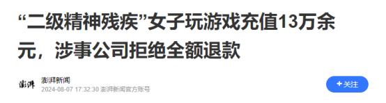玩游戏充了十三万?四川成都,一患有精神问题的女子玩游戏时,为了让自己有牌面,霸占榜首,竟然豪掷13万元人民币充值游戏币,来获取豪华装备,事后反应过来,要求要求游戏公司退钱,游戏公司这样回复。 “这群里都是他们的员工,他们在诱导我充值。”女子情绪激动的描述着自己充值行为是怎么回事,而游戏公司的相关人员认为女子的行为属于自主行为。 究竟是一款什么游戏竟然引得女子如此投入,竟然往里面充值这样一笔巨款,这背后是否存在着诱导行为,而女子的精神状况似乎也有着不一样的情况,最后的结果又是如何。 (主要信源:澎湃新闻—2024.08.17《“二级精神残疾”女子玩游戏充值13万余元,涉事公司拒绝全额退款》) 一款修仙养成游戏火了起来,玩家扮演一个刚刚入世的小妖,通过一系列手段最终成为一方巨擘的养成模式,而女主小悦在今年的五月成为这款游戏的忠实玩家。 在游戏中想要快速提升实力,往里面充值游戏货币是一种简单快捷的方式,这款游戏也不例外,里面的充值礼包有多个档位,小到6块,大到两千。 刚开始小悦是从某团平台点进这款游戏的,在游戏的聊天界面,一些老玩家表示有快速提升实力的方式,并提供了一个微信群号。 游戏玩家多多少少都会有些胜负欲,小悦为了自己的游戏名字能够出现在游戏榜首的位置,就加入了这个微信群,群里的“游戏大佬”表示充值的话比较快达到自己目的的方法。 一月的时间里,小悦充值了三万多块钱,将自己的游戏角色提升到了一个不错的程度,慢慢的她发现,群里这些给自己支招的玩家,好像并没有充钱,她也就没再玩这款游戏。 直到这款游戏在微信的小程序中出现,小悦得知这次的新区开服,优惠力度非常的大,于是又在微信小程序上玩了起来,一样的配方,小悦的充值行为并没有停下来。 就这样她的排名一直上升,直到她回过头的时候,发现自己又充值了九万多,这样的情况让她心里无比的后悔,当即便向游戏公司的客服申请退回自己的十三万巨款。 而游戏公司当然不可能给其退还,无奈之下小悦和家人只好求助媒体,而经过媒体的调查发现了小悦的另一种情况——不具备民事行为能力。 原来小悦自小跟随姥姥姥爷一起生活,因为复去的过早离开,小悦存在一些重度抑郁的精神异常,这一状况在当地的司法鉴定机构出具的鉴定书中也有明确的指出。 而在经过多次的协商之后,根据小悦没有民事行为能力这样的情况,游戏公司做出了退还30%的决定,但是小悦和家人对于这样的处理方案并不接受。 又是一番相互扯皮之后,该游戏公司处理这一事件的相关人员表示可以退回60%,不会再多了,而这一方案小悦依旧是没有接受,而目前事件还在进一步的发展中。 游戏终归只是游戏,虽然游戏里的实力强大会让人感到一时的身心愉悦,但是那些东西终究只是虚拟的,玩游戏可以,但不要让游戏玩了你。