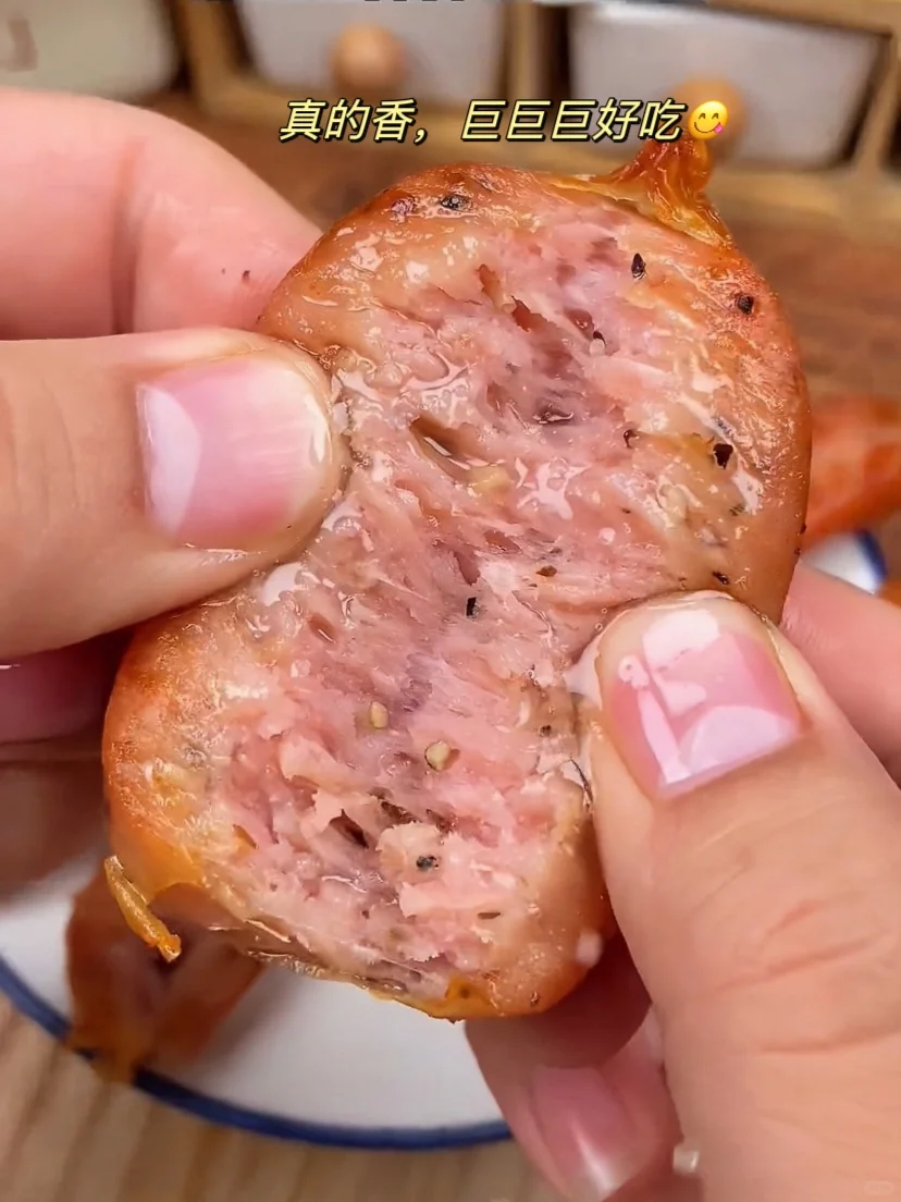 呜呜呜在家实现脆皮烤肠自由了! 这个烤肠真的绝了🤤真的一口下去全是肉👍 整个屋子香喷喷~真的巨nun,爆汁儿口感真的绝! ! 越嚼越香,秒所有小吃摊、便利店的烤肠! !
