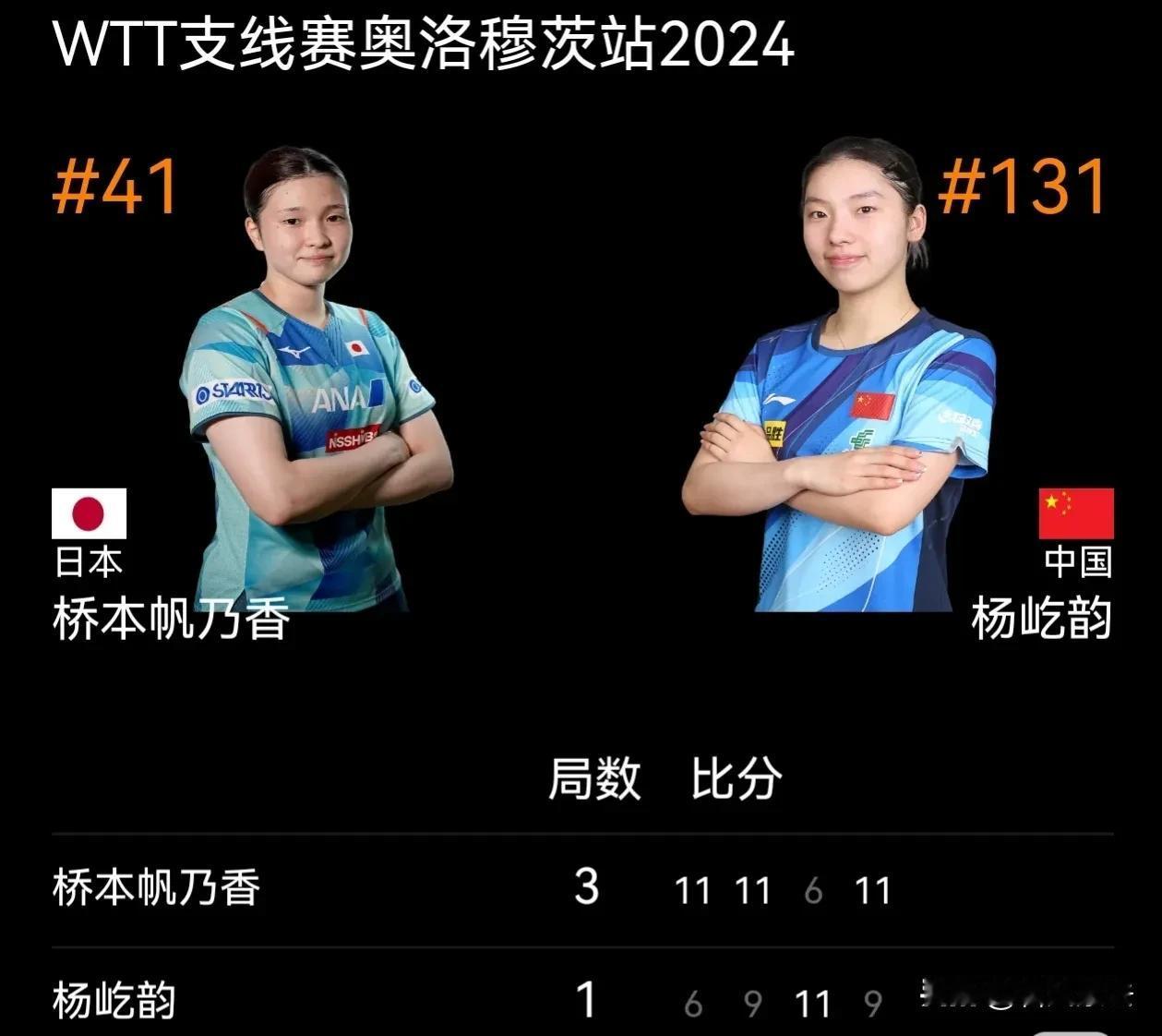 WTT支线赛奥洛穆茨站女单决赛赛果: 日本桥本帆乃香以3-1(11-6, 11-9, 6-11,11-9)的比分战胜国乒杨屹韵,荣获冠军。杨屹韵则获得亚军。恭喜两位选手的出色表现!
