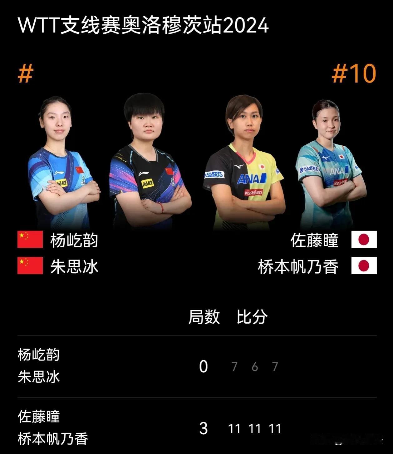 WTT支线赛奥洛穆茨站女双决赛赛果: 中国组合朱思冰/杨屹韵遗憾以0-3不敌日本组合桥本帆乃香/佐藤瞳,具体比分为7-11, 6-11, 7-11。桥本帆乃香/佐藤瞳凭借出色的发挥夺得本站女双冠军。同时,朱思冰/杨屹韵也展现了不俗的竞技水平,获得亚军,期待她们未来能有更加精彩的表现。