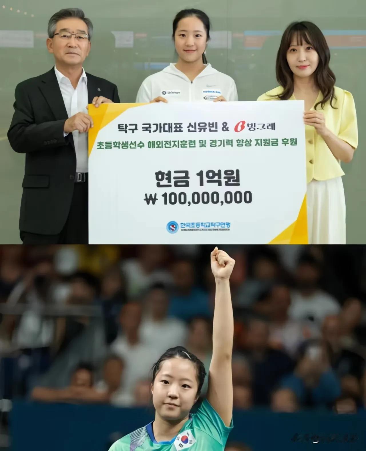 申裕斌:捐赠1亿韩元(53万元)的广告费,交给韩国小学乒乓球联盟 乒坛新星申裕斌,在巴黎奥运闪耀光芒,女单、混双、团体三线齐进四强,双铜在手,荣誉满载!但她的光芒远不止于赛场,更在慈善路上熠熠生辉。 东京奥运会后,她慷慨捐出8000万韩元,温暖儿童癌症患者的心房,彰显大爱无疆。从乒乓器材到女性健康用品,从单亲家庭到独居老人,申裕斌的善行遍布韩国每个角落,用实际行动践行社会责任,传递正能量。她的每一次善举,都是对“能力越大,责任越大”的最好诠释,成为了无数人心中的光。 巴黎奥运后,申裕斌更是喜获知名香蕉牛奶品牌青睐,成为其代言人。而她却将这份荣耀转化为更多的爱,决定将代言费1亿韩元(约合53万元人民币)全额捐赠给韩国小学生乒乓球联盟,助力小将们海外逐梦,续写乒乓辉煌。这份深情厚谊,不仅是对乒乓球事业的热爱,更是对青少年未来的殷切期望。 申裕斌,一个用球拍书写传奇,用爱心温暖世界的名字。她用自己的行动证明,真正的强者不仅在于技艺超群,更在于心怀大爱,勇于担当。在这个充满挑战与机遇的时代,申裕斌无疑是我们每个人学习的榜样,激励着我们在各自的领域发光发热,共同创造更加美好的未来!