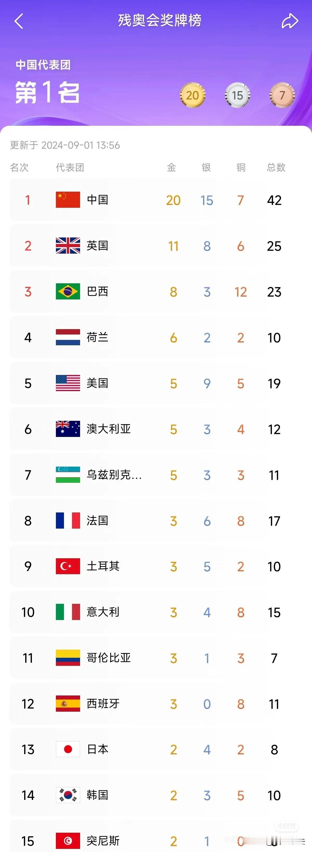 大家关注一下残奥会,分享目前的奖牌榜 截至当前时间,残奥会奖牌榜上,中国代表团以显著的优势暂居首位,共获得金牌20枚、银牌15枚、铜牌7枚,奖牌总数达到42枚。 中国代表团在多个项目中展现了强大的竞争力和卓越的表现,遥遥领先于其他参赛国家,彰显了我国残疾人体育事业的蓬勃发展和运动员们的顽强拼搏精神。
