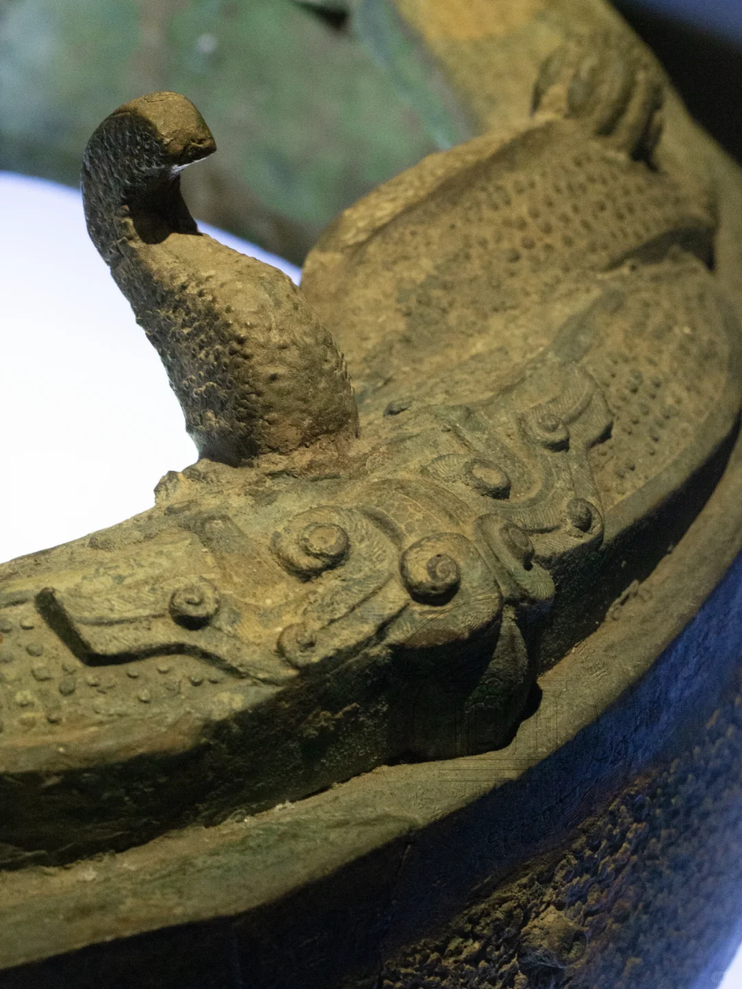 📍鼓座为圆圈形,上沿四周运用高浮雕的手法塑有怒吼的猛虎与独角翘立的游龙,造型奇特,体型巨大,气势雄浑。器身满饰羽翅纹。外壁饰四个衔环铺首。 从铭文看,此鼓座为钟离公自用之器。建鼓在古代常用于战争、祭祀、娱乐等场合,一般由鼓座、楹杆和形体硕大的鼓体三部分组成,楹杆上部还有旌旗或羽毛之类的装饰物,由两个鼓手相对敲击。