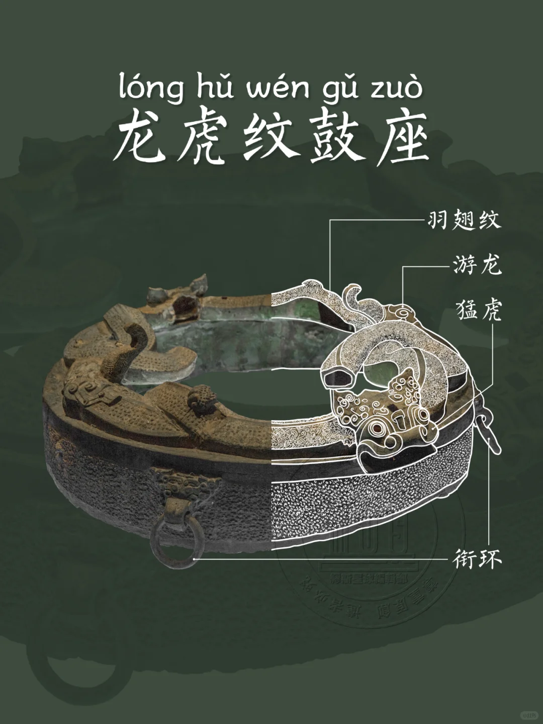 📍“一鼓作气,再而衰,三而竭”。行军打仗时,建鼓可以指挥军队的进退、鼓舞士兵的士气。宴乐礼仪场合时。建鼓还可作为乐鼓鸣乐伴奏。有了这件龙虎纹鼓座。战鼓“底盘”更稳。乐鼓“声音”更响。