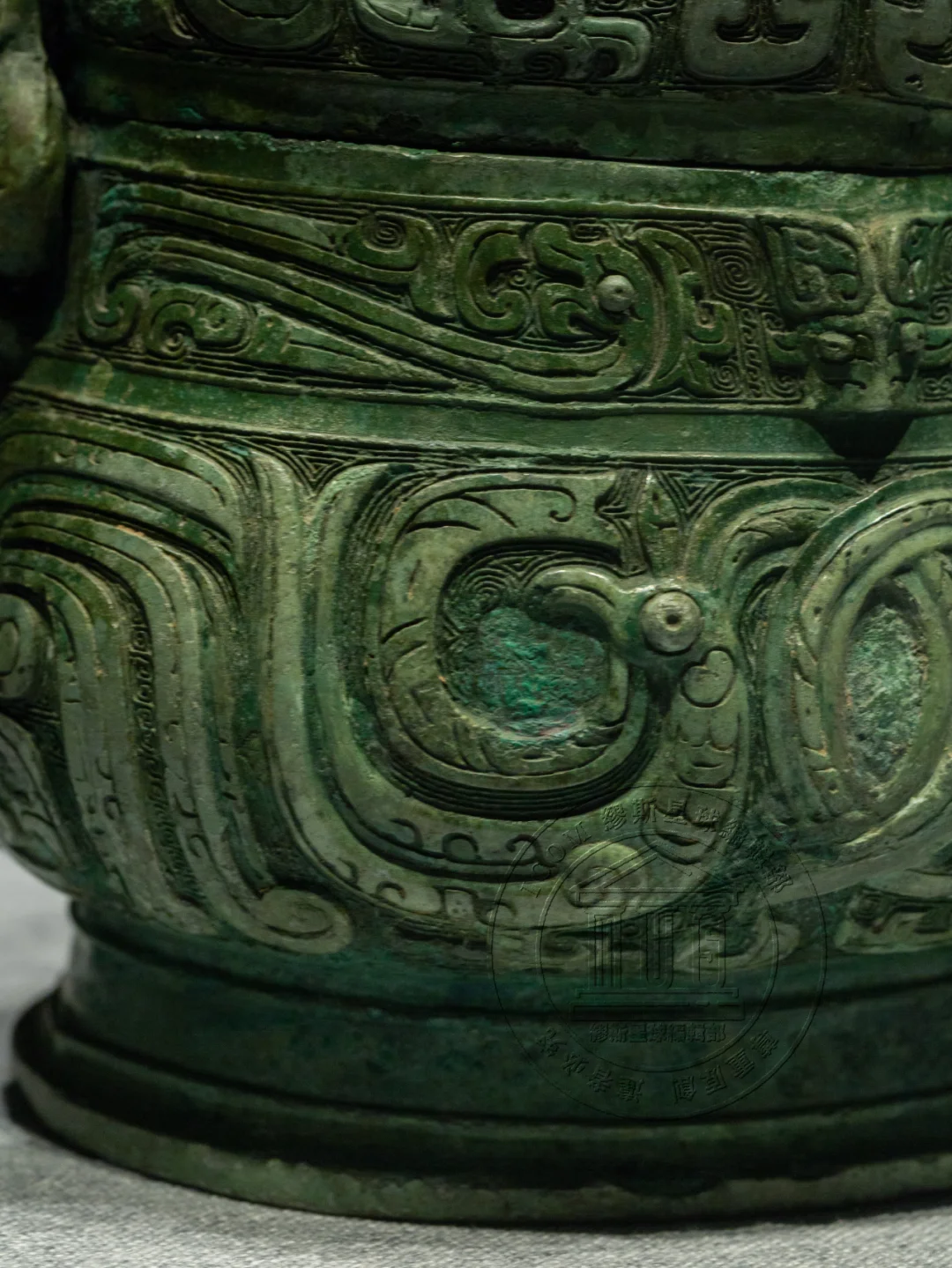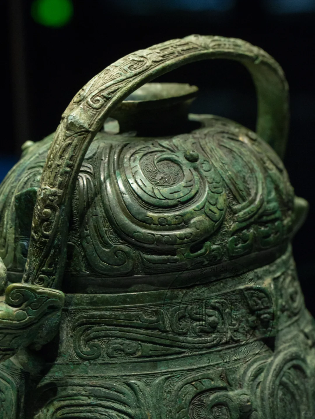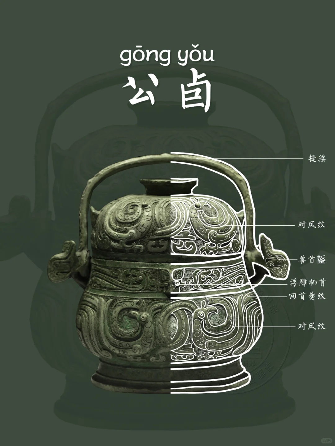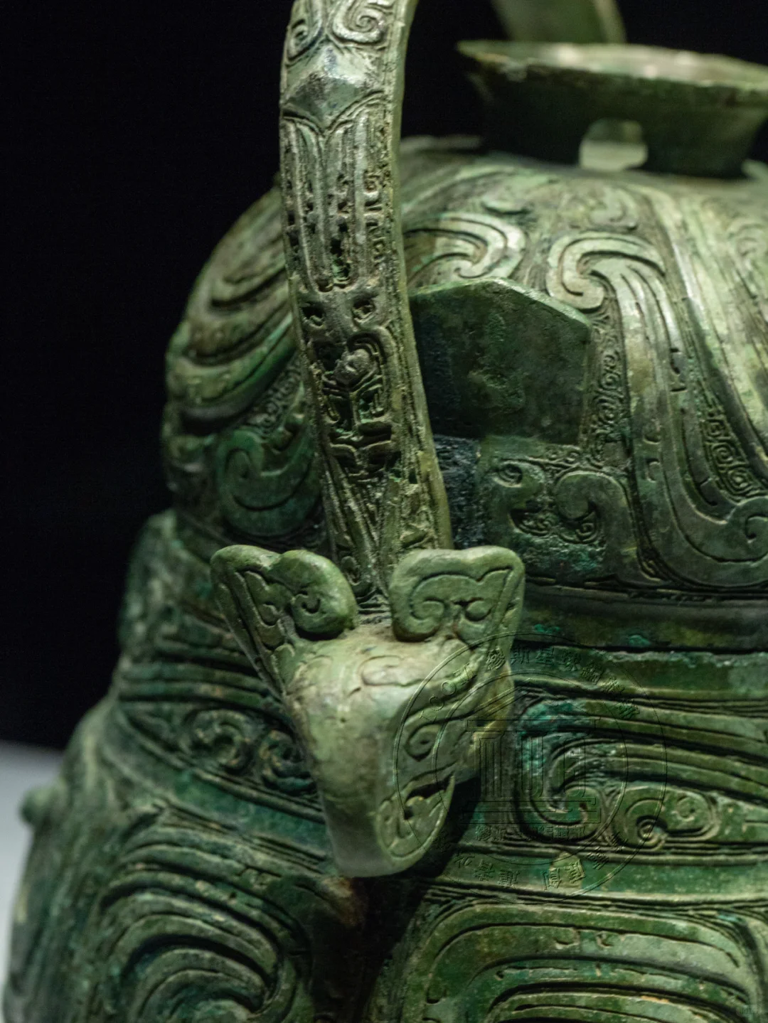 📍公卣外观,低体垂腹,横截面呈椭圆形,提梁上装饰着蝉纹,颈部装饰有回首夔纹,中间置有浮雕牺首。盖和器身上都装饰了对凤纹,凤首回顾,羽冠相交下垂,展现出独特的艺术美感。器身两面的纹饰略有差异,这种细微的变化增加了其艺术价值。该卣通体纹饰,华丽精美,整体造型为中原风格,而薄壁俊秀一改中原卣的厚重粗实,也侧面反映出南方青铜文化与中原地区极深的渊源关系。