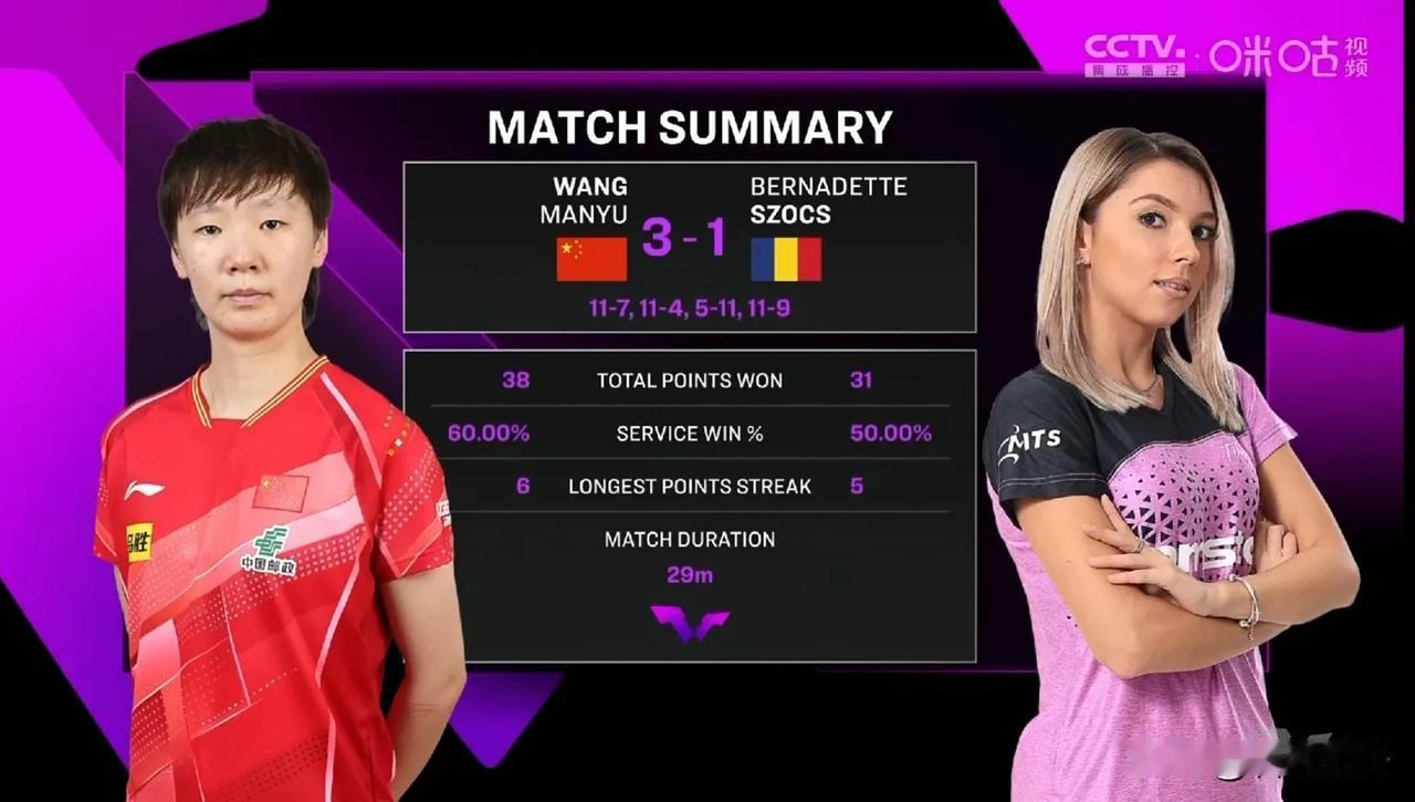 快讯:澳门赛上王曼昱为国乒迎来开门红 王曼昱以精湛技艺和顽强意志,以3-1的比分力克斯佐科斯,挺进16强。 首局虽遭遇挑战,但王曼昱迅速调整,以11-7逆转取胜。次局,她更是势如破竹,以6-1开局并持续扩大优势,以11-4再下一城。第三局,面对斯佐科斯的反击,王曼昱展现出色应变能力,以11-5扳回一局。末局,她乘胜追击,以稳定发挥锁定胜局,为中国队赢得宝贵胜利。 王曼昱的卓越表现不仅彰显了个人实力,更为中国乒乓球队增添了信心与荣耀,期待她在后续赛事中再创佳绩。
