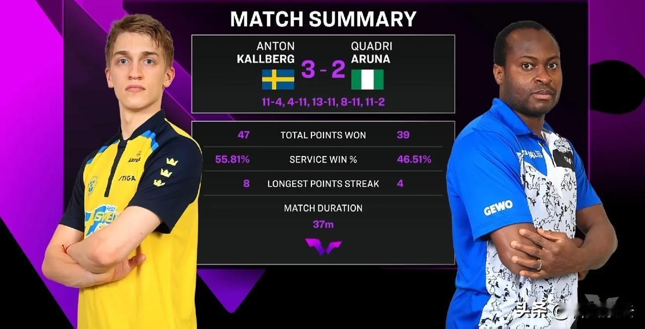 卡尔伯格3-2力克阿鲁纳,晋级16强 北京时间9月10日,2024乒乓球澳门冠军赛男单1/16决赛激战正酣。以一场酣畅淋漓的瑞典卡尔伯格3-2尼日利亚阿鲁纳,强势挺进男单16强。 具体比分分别为11:4、4:11、13:1、8:11和11-2。