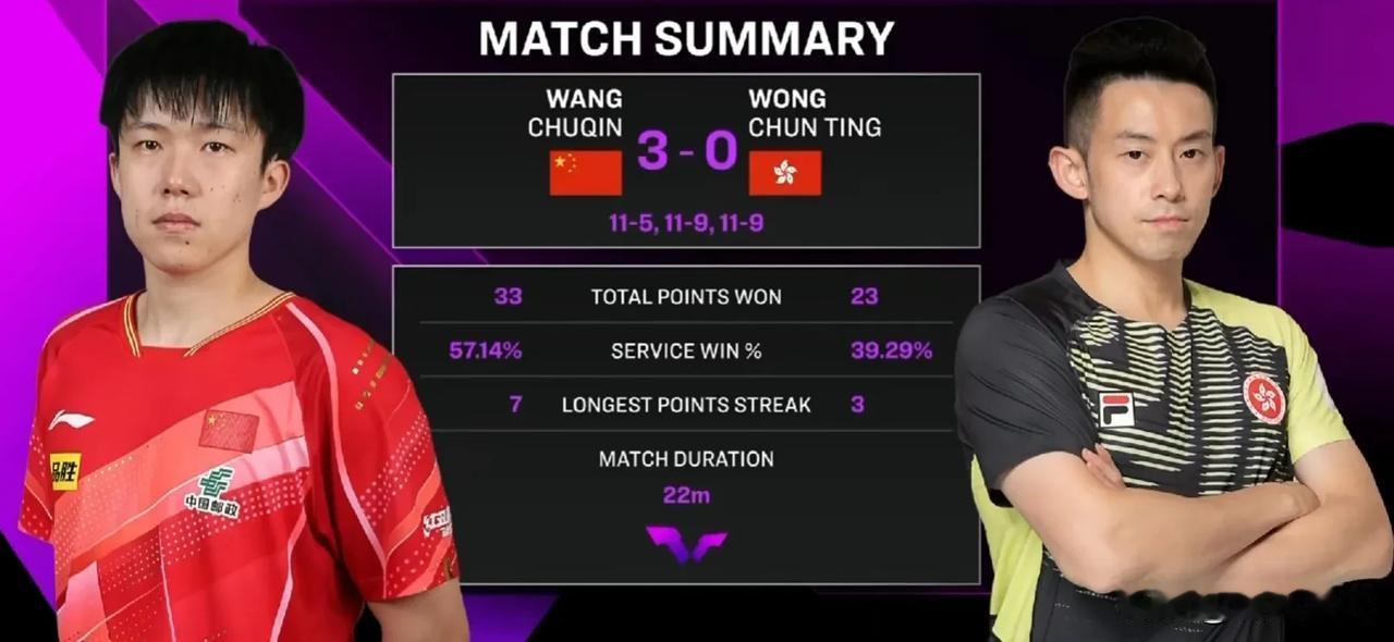 快讯:王楚钦首秀战胜黄镇廷,挺进16强 在WTT冠军赛澳门站男单1/16决赛中,中国选手王楚钦以3-0的比分击败中国香港黄镇廷,三局比分分别为11-5、11-9和11-9。 王楚钦展现了出色的竞技状态,恭喜他顺利晋级下一轮比赛。