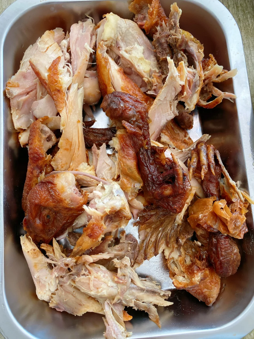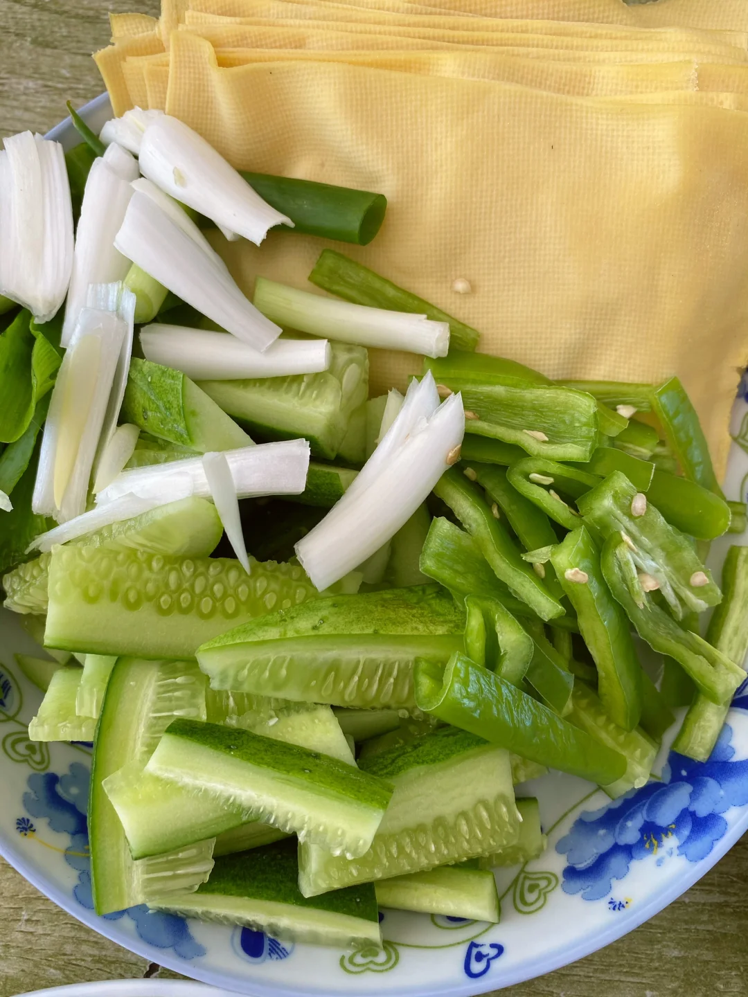 干豆腐卷大葱,烧鸡,蘑菇炒辣椒,苞米面大饼子😋