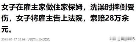 上海,一保姆在男雇主家的浴缸洗澡,就在她挂衣服的时候,不慎摔倒导致骨折,男雇主立即叫上妻子,送保姆去医院,并垫付了4.2万元医药费。可事后保姆却向雇主索要24.3万赔偿,并认为保险理赔款的4万也该归她。双方协商不成对簿公堂,法院的判决亮了。 (案例来源:上海市浦东新区人民法院) 老李万万没想到,自己掏心掏肺对待的保姆刘梅,有一天会把他告上法庭索赔28.3万!这究竟是怎么一回事? 故事还得从头说起。老李和老伴身体一年不如一年,几年前他们请了保姆刘梅来家里帮忙。刘梅勤快麻利把家里打理得井井有条,老两口对她赞不绝口。时间久了两家人处得跟亲戚似的,老李甚至把刘梅当成亲妹子看待,平日里有什么好吃的、好用的都想着她。 然而谁也没想到,一场突如其来的意外打破了这份平静。 一天晚上刘梅在老李家吃完饭后,像往常一样去浴室洗澡。她刚踏进浴缸,突然想起贴身衣物还没脱,于是便站在浴缸里伸手去拿放在一旁的衣服。 谁知浴缸表面湿滑,刘梅一个重心不稳重重地摔倒在地! 听到浴室里传来的巨响,老李赶紧跑过去查看情况。结果他刚打开浴室门,就看到刘梅一丝不挂地躺在地上痛苦呻吟。 老李顿时老脸一红慌忙退了出来赶紧给老伴打电话。 老伴闻讯赶回家和老李一起把刘梅送到了医院。经医生诊断,刘梅肋骨骨折脾脏破裂需要立即手术。 老李二话没说先垫付了4.2万元的医药费,并在医院里衣不解带地照顾刘梅,直到她的家人从外地赶来。原本以为事情到这里就告一段落了。 然而让老李没想到的是这只是噩梦的开始。 刘梅出院后被鉴定为八级伤残。她认为自己之所以会摔倒,是因为老李家浴缸设计不合理存在安全隐患,老李作为雇主应该为她的意外承担全部责任。 于是刘梅一纸诉状将老李告上了法庭索赔24.3万元。 不仅如此刘梅还提出,老李之前为她购买的一份“家政无忧险”,受益人应该是她要求老李将4万元的理赔款也一并交给她。面对刘梅的“狮子大开口”,老李又气愤又委屈。 他认为刘梅摔倒完全是意外,而且事发时她已经下班,洗澡属于个人行为他并没有义务为此事负责。 更何况他已经垫付了4.2万元的医药费还买了保险,仁至义尽了。双方各执一词争执不下最终对簿公堂。 法庭上双方律师围绕着事发经过、责任认定等问题展开激烈辩论。 刘梅的律师指出根据《民法典》相关规定,雇主有义务为雇员提供安全的劳动场所和劳动条件,并采取必要的安全措施,防止劳动过程中的意外发生。 本案中老李作为雇主,未能尽到保障刘梅安全的义务,导致其在工作场所受伤,应该承担相应的赔偿责任。 而老李的律师则反驳称刘梅摔倒时并非工作时间,洗澡属于其个人行为与工作无关。而且老李家中的浴缸是正常安装使用的,并不存在设计缺陷或安全隐患。因此老李不应为刘梅的意外承担责任。 为了查明真相法院对事发浴室进行了现场勘查并调取了相关证据。最终法院认定刘梅摔倒的原因是其自身操作不当,与浴缸设计无关老李无需承担赔偿责任。 法院的判决引发了社会的广泛关注和热议。有人认为刘梅的做法太过分了,明明是自己不小心摔倒却想讹诈老李,简直是“农夫与蛇”的故事重演。 也有人表示同情老李的遭遇,认为他好心办坏事反而被保姆倒打一耙。 “浴室摔倒案”的落幕,留给我们的是深刻的反思。这起案件的警示意义在于: 雇主和保姆都要增强法律意识,明确自身权利义务,避免因法律知识的缺乏而引发纠纷。 雇主应为保姆提供安全的工作和生活环境,并根据实际情况为其购买意外伤害保险。保姆应尽职尽责地完成工作,提高安全防范意识,避免发生意外事故。双方应加强沟通交流,及时解决矛盾纠纷,避免因误解和猜忌而导致关系破裂。 构建和谐的雇佣关系需要雇主和保姆共同努力。只有双方相互尊重、相互理解、相互信任,才能营造温馨和谐的家庭氛围实现互利共赢。