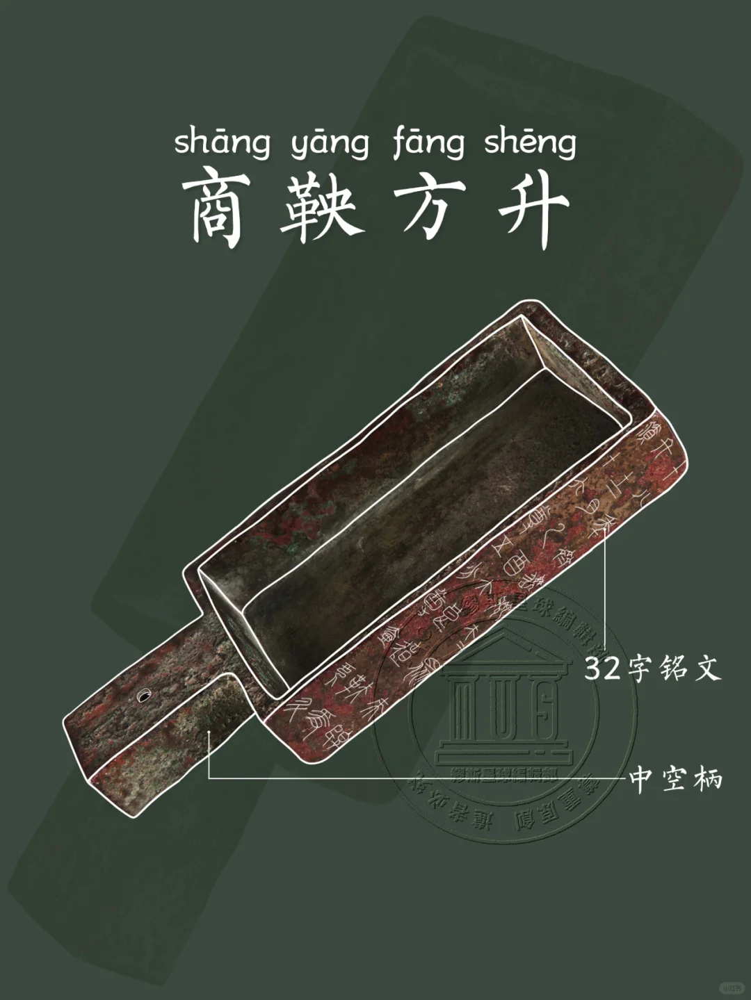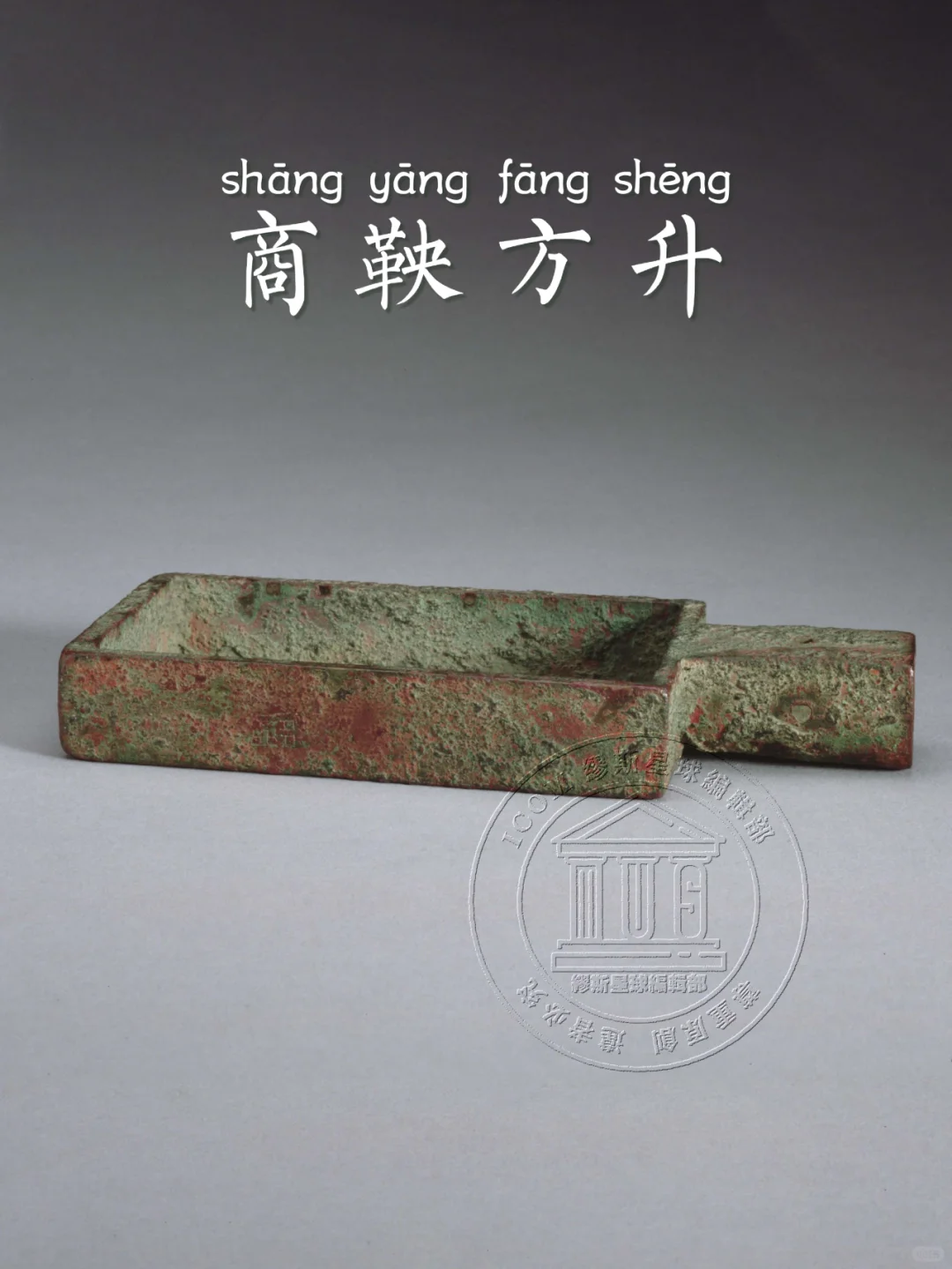 📍战国商鞅方升是一个由几何直线组成的斗状物,呈长方形,直壁,后有长方形柄。刻铭详尽、标称值明确、器型完整、制作精良。外壁刻铭文七十五字,记载秦孝公十八年(公元前344年),大良造鞅颁布标准计量器,以十六又五分之一立方寸为一升。“大良造鞅”即商鞅,该件器物因此得名。