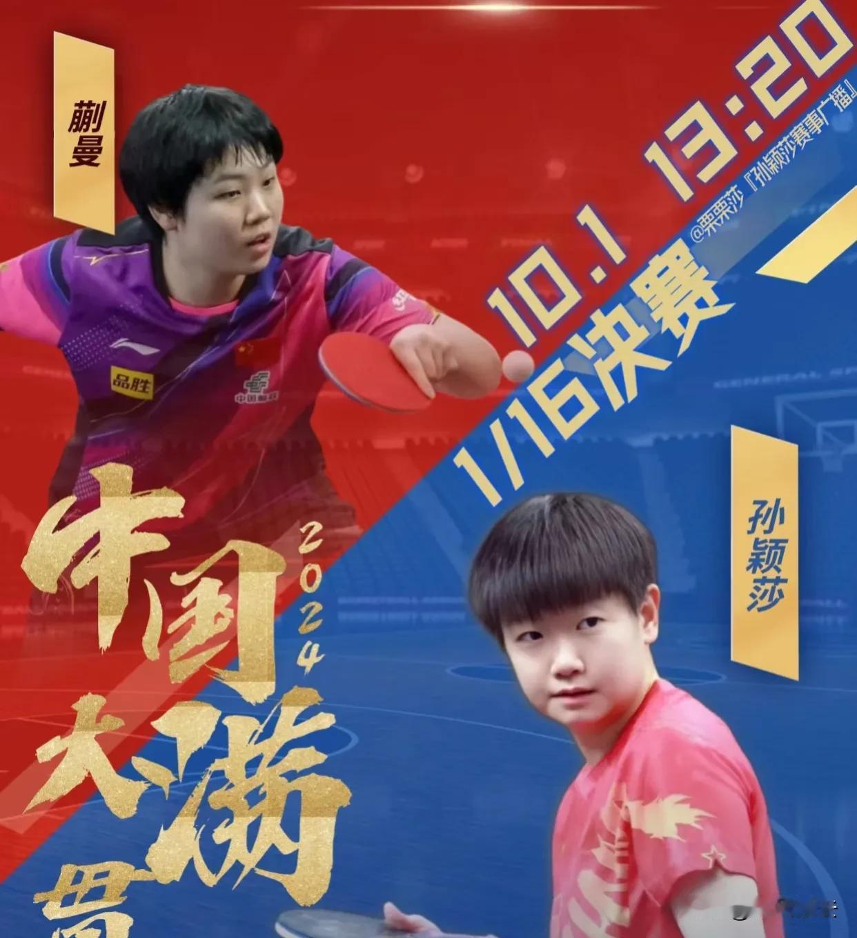 北京大满贯女单1/16决赛国乒对阵名单: 孙颖莎-蒯曼(德比之战) 刘炜珊-陈思羽 (中国台北) 范思琦-李恩惠(韩国) 王晓彤-波尔卡诺娃 (奥地利) 陈熠-长崎美柚 (日本) 陈幸同-杜凯琹 (中国香港) 何卓佳 -曾尖(新加坡) 纵歌曼 -单晓娜(德国) 覃予萱 -黄怡桦(中国台北) 王曼昱-萨比亚·温特(德国)