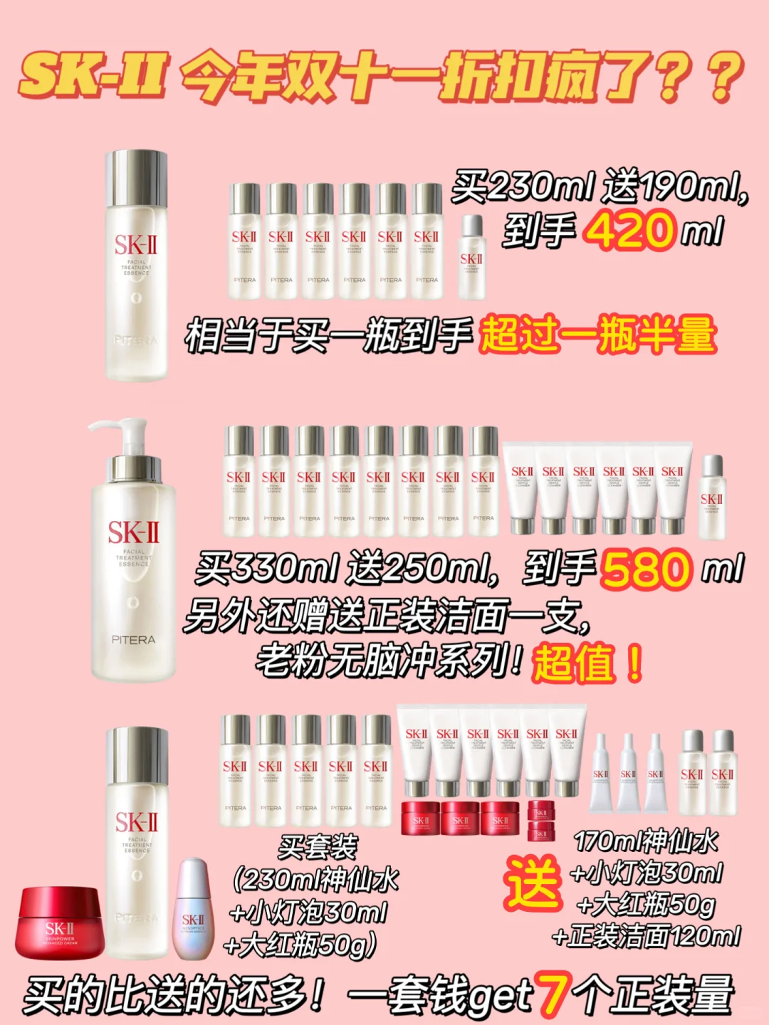 送170ml神仙水+小灯泡30ml+大红瓶50g+正装洁面120ml。买的比送的还多!一套钱get7个正装量,一度怀疑SK-II是不是算错了,诚意太足!
