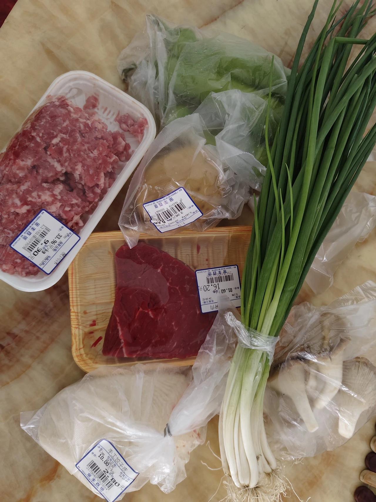 南方的朋友回避一下,我向北方的朋友汇报一下我今天购买的食材。坐标广西桂林。两个人的家常菜。小葱是可以买几颗的,猪肉是可以剁碎了的,饺皮是擀好了的,买回家搅拌一下肉馅做成饺子,明天早上的早餐就解决啦。排骨可以买一根的,商家还细心地帮我砍成小块装包,再买几朵菌子,配上家里买的淮山,排骨汤就oK了。青椒三个,土豆一个,里脊牛肉一片,牛肉炒土豆的味儿够美吧。#当天采购好食材# #最接生活的食材#