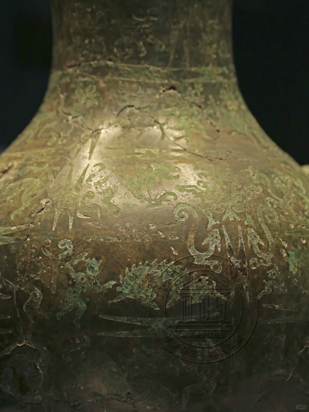 📍壶身分为多个场景,以线刻工艺表现出人物、鸟兽、狩猎等画面。这些图像的出现说明人们对再现客观世界的实践已在懵懂中迈出试探的脚步,中国艺术的状物传统由此初见端倪。