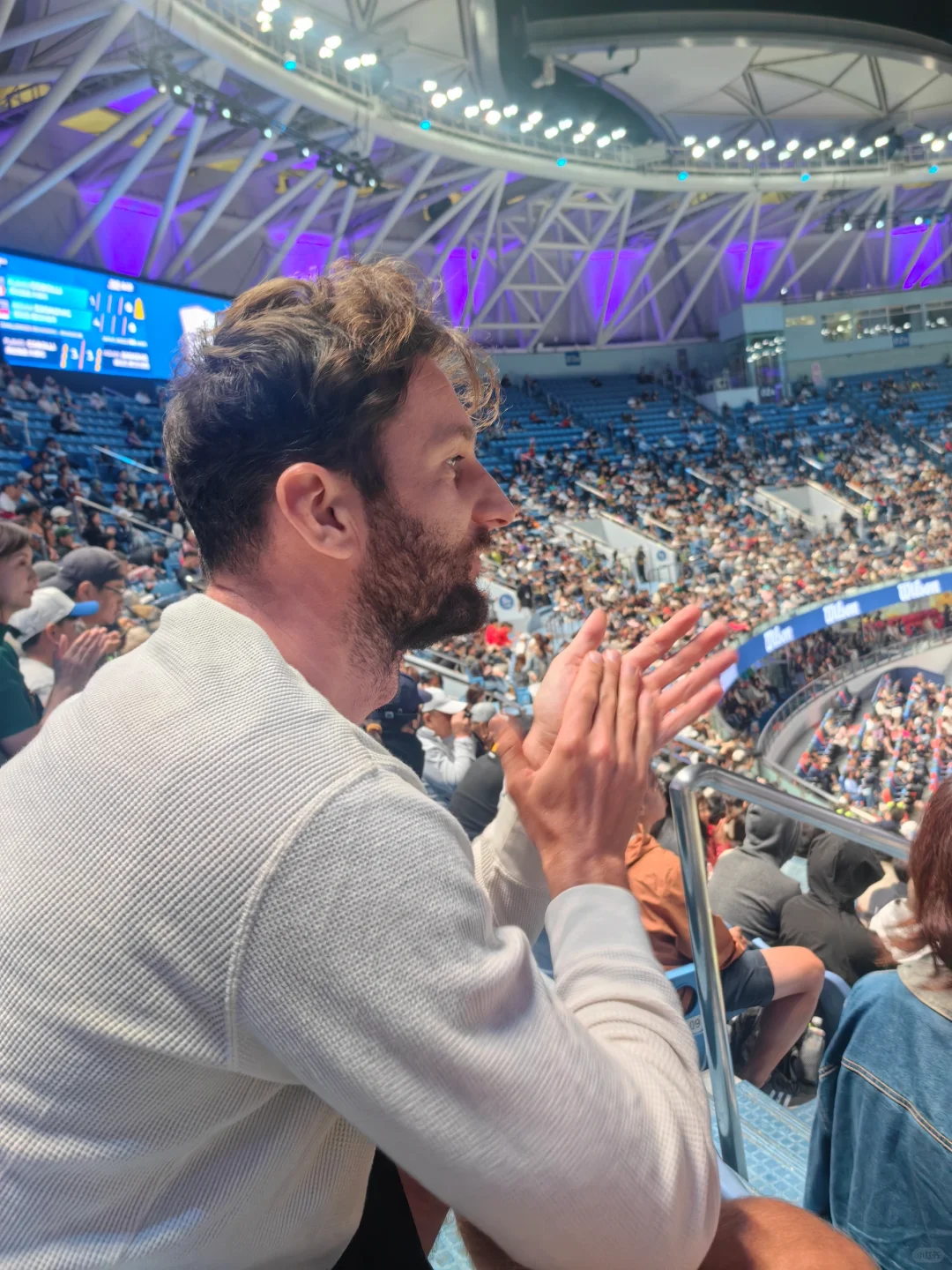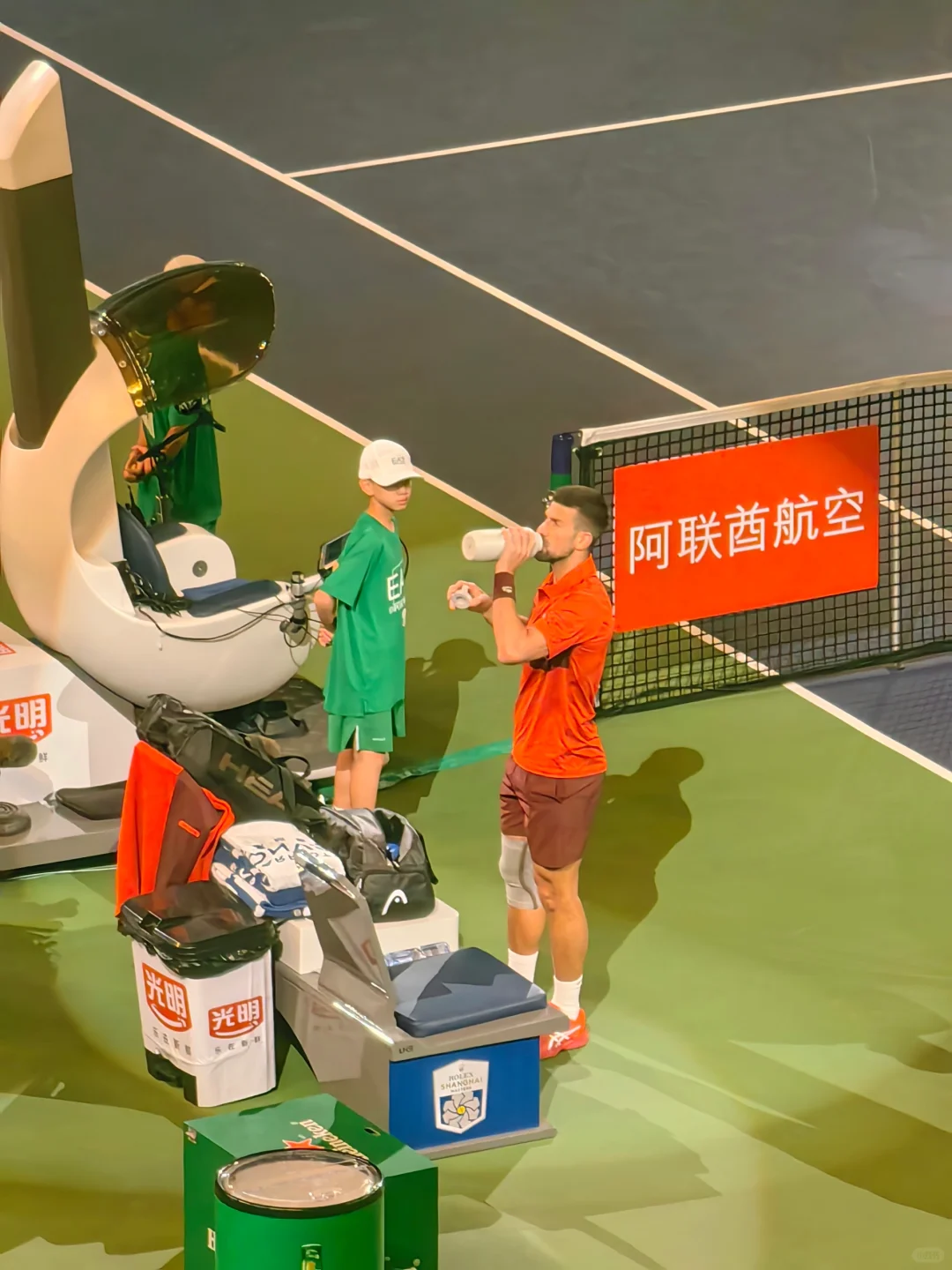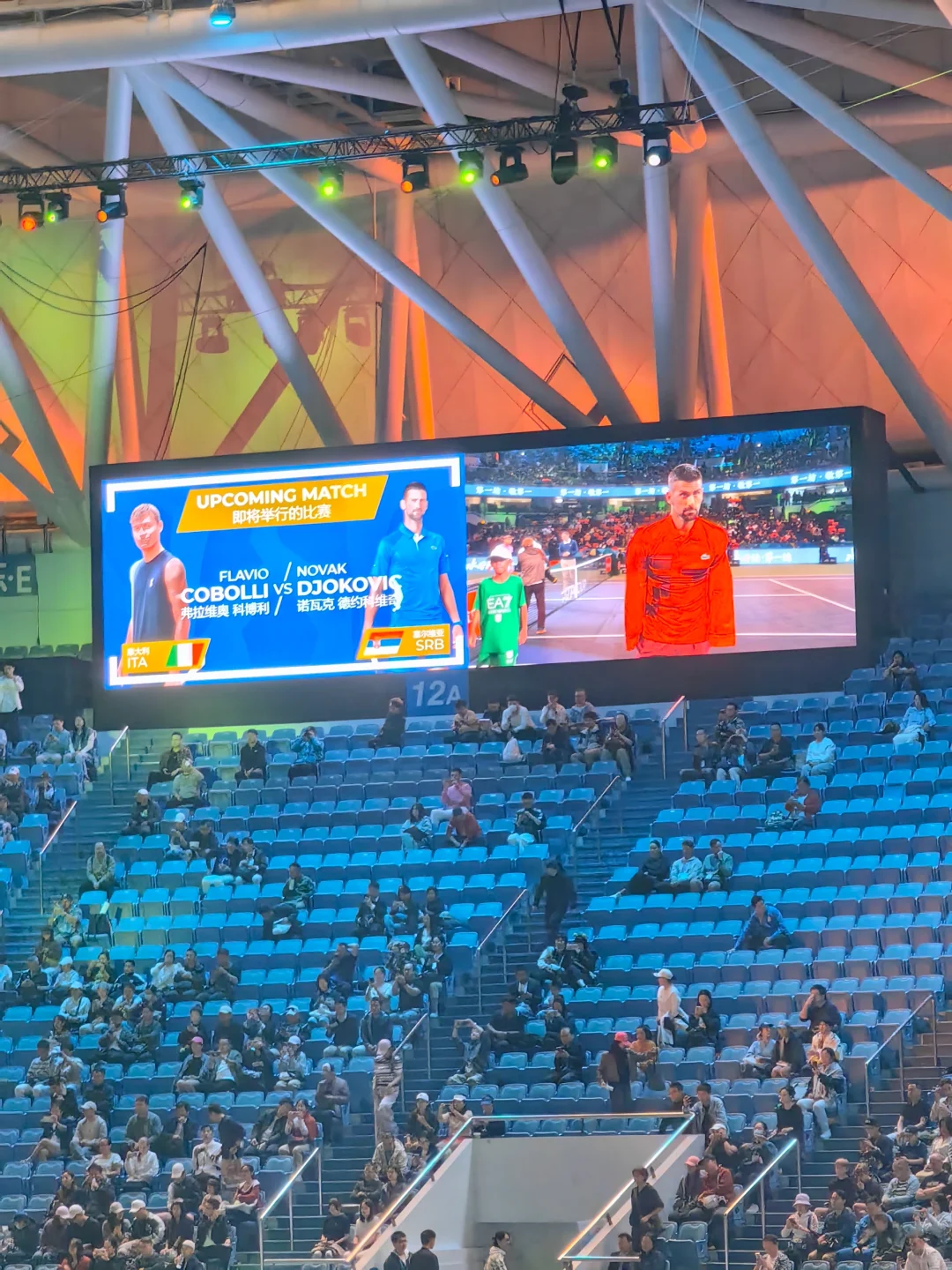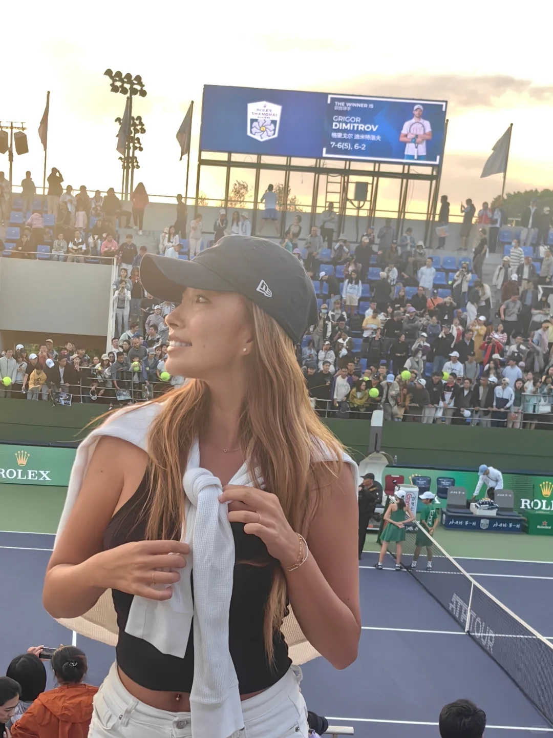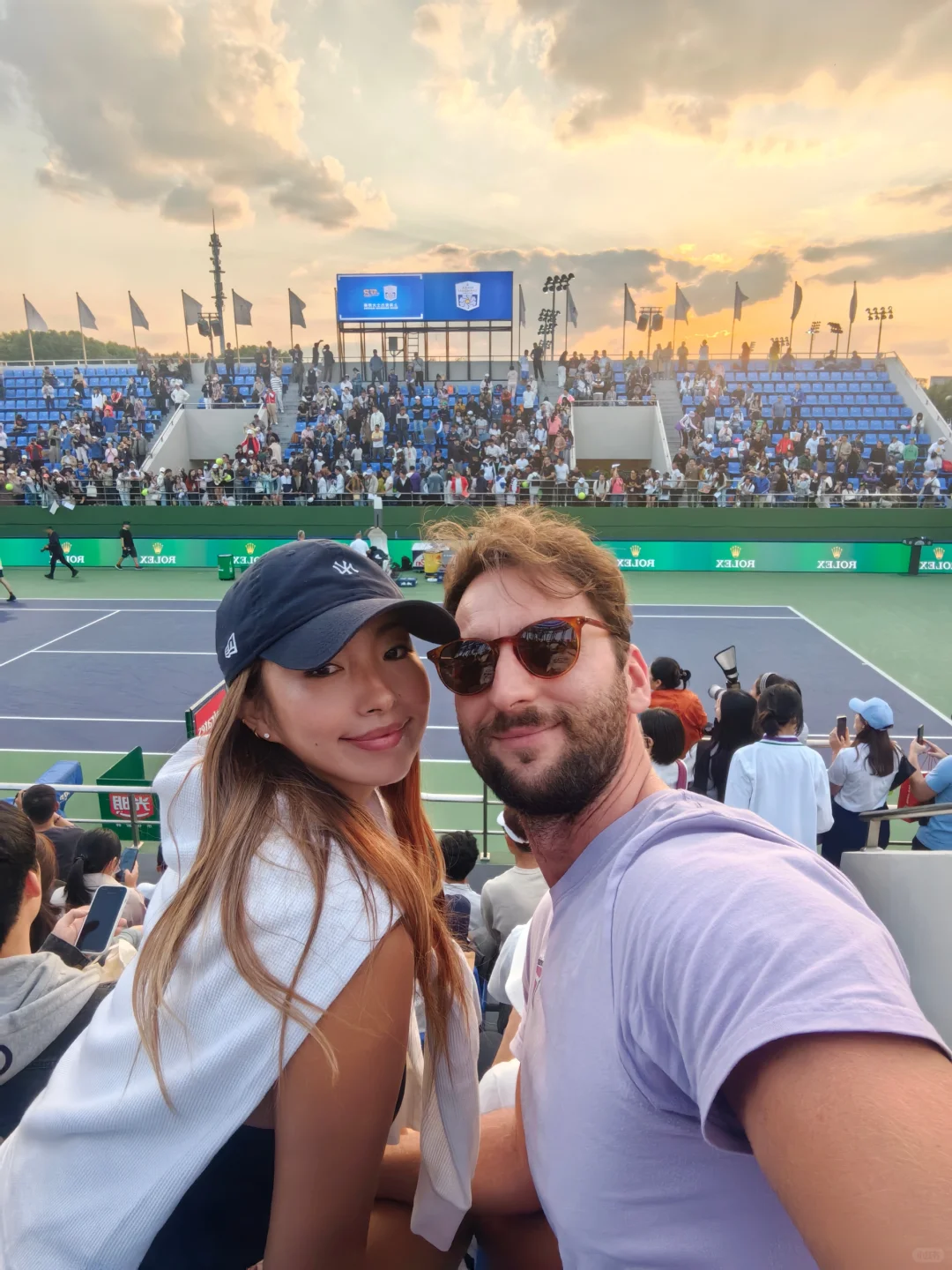 买了晚上德约的票 他貌似一直都是晚上打🧐帅帅帅帅 !💓还看到了迪米和鲁内 外场打的 帅帅帅!😍买了🍺再喝多点球也看不见了🫠坐朝太阳的 晒是晒 但是可以看夕阳啊 ps: 纪念日当然要百合花😘