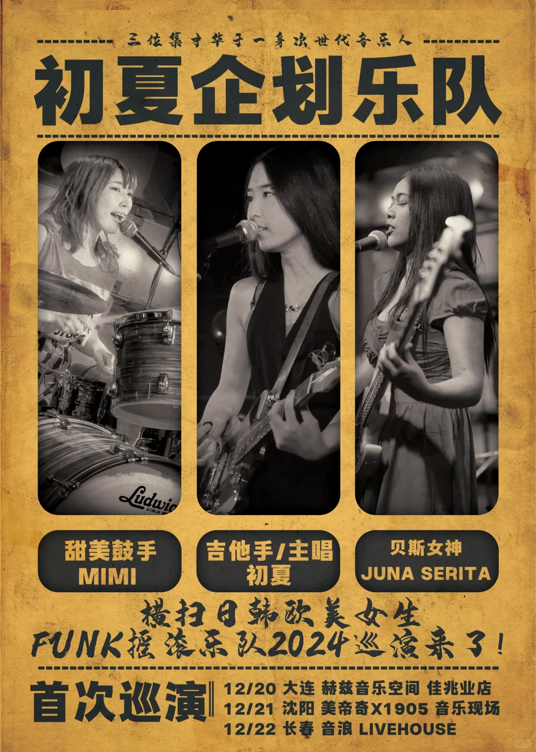 吉他手/主唱初夏年少成名,TOKYO GIRLS奖项加持,中岛美嘉一起上电视,FUJI ROCK等大型音乐节常客 超级贝斯手Juna Serita!迷倒万千乐迷的放克公主!次世代NO.1贝斯女神!Juna来啦,快来围观! 甜美鼓手mimi (Kawakami Ayumi),也是神番《凉宫春日的忧郁》原声乐队现场鼓手,City pop贵公子角松敏生指定鼓手, 超人气乐队--和楽器バンド吉他手-町屋(別名:桜村眞)个人企划鼓手! 三位集才华于一身超级次世代音乐人组建,出道横扫日韩欧美!在她们的创作中,Funk、Soul、R&B、Rock、Jazz、甚至Blues元素信手拈来。6张广受好评的创作专辑,加上在FUJI ROCK、NAON NO YAON、OTODAMA音泉魂、YUYA UCHIDA、NEW YEARS WORLD ROCK FESTIVAL等,国际音乐节舞台上的卓越表现,让小小年纪的她们在世界舞台上掀起了不小的风浪。 首次中国巡演,东北先行,期待加场! 12/20 大连 赫兹音乐空间 佳兆业店 12/21 沈阳 美帝奇X1905 音乐现场 12/22 长春 音浪 LIVE HOUSE 评论区置顶: 【演出现已全站开票】 搜索【初夏乐队】 12/20 大连 赫兹音乐空间 佳兆业店 12/21 沈阳 美帝奇X1905 音乐现场 12/22 长春 音浪 LIVE HOUSE 标签: