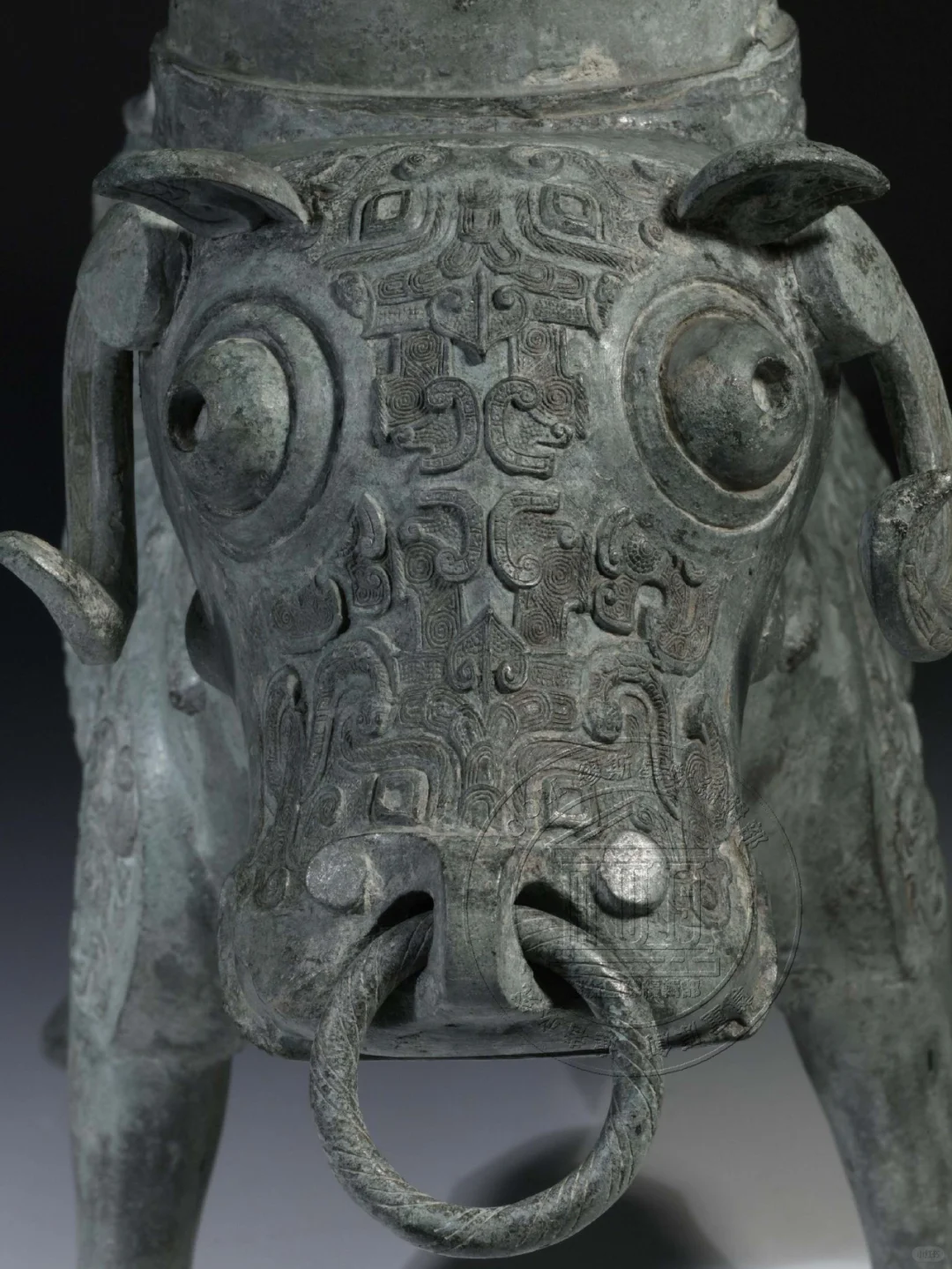 此器形态稳重,虽然四足矮短,但牛首上充满张力的双角、圆瞪的双目保持了真实感,使造型与实用和谐地结合在一起。身上各个部位装饰有各类纹饰,通过纹饰可以看出当时印模技术的使用。在牛颈及锅形器上还饰有虎、犀等小动物的浮雕,形态生动,铸作精美。
