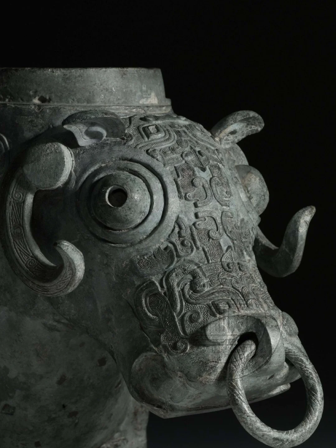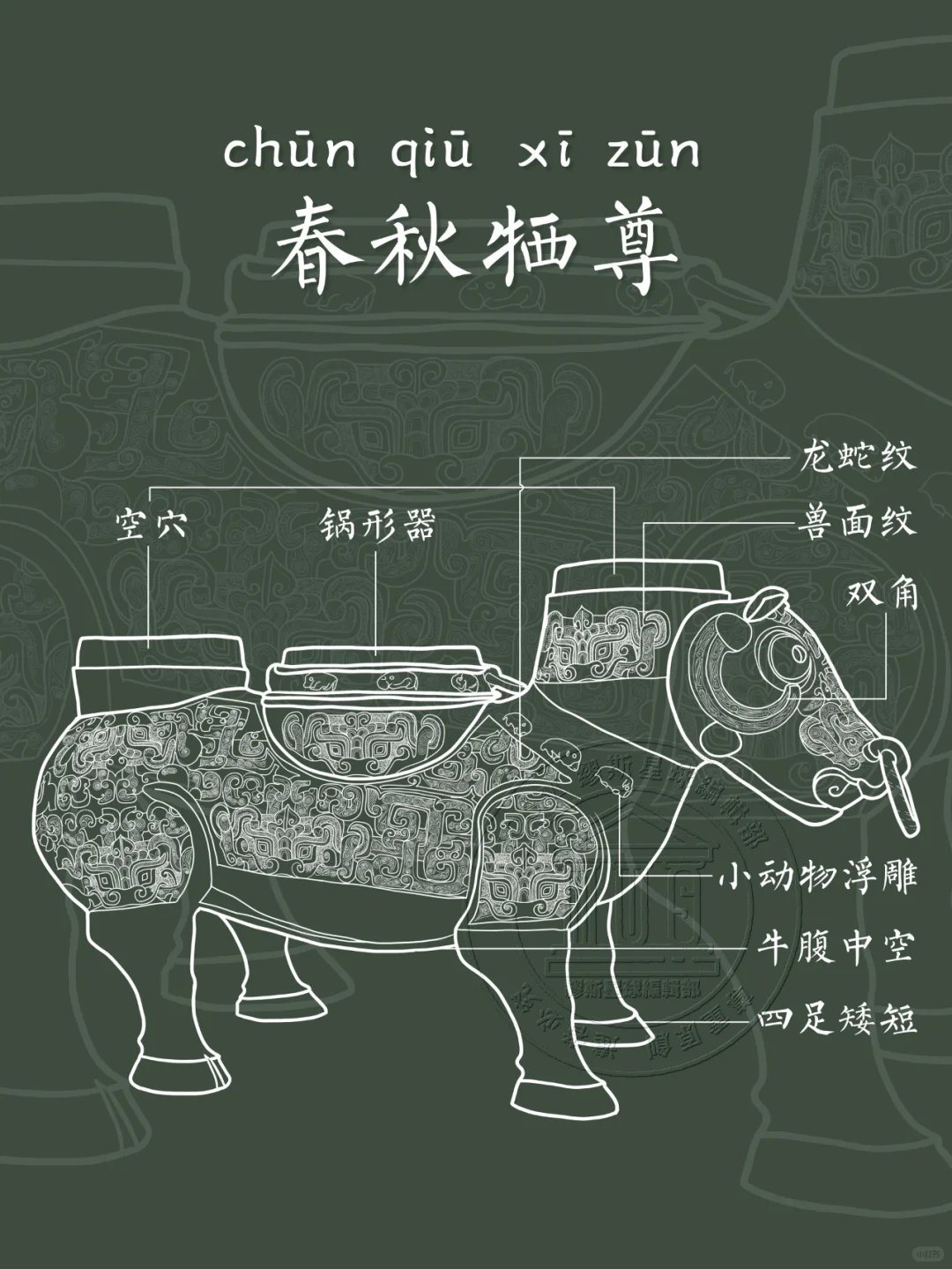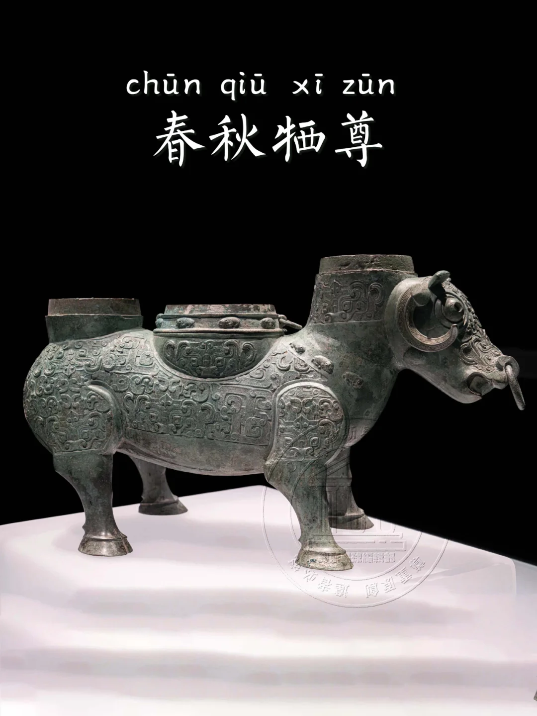 📍牺尊是非常奇特的一件作品,它高33.7cm、长58.7cm,重10.76千克,铸成一颇为写实的耕牛形。牛腹中空,牛颈和背脊上有三个孔,中间一孔套有一锅形器,可以取出,出土时锅上原有盖,今不知所归。从其结构来看,这是一件兼可温酒的容酒器:牛背上的锅形器可以容酒,牛颈及背上的空穴可以注水于尊腹以温酒。