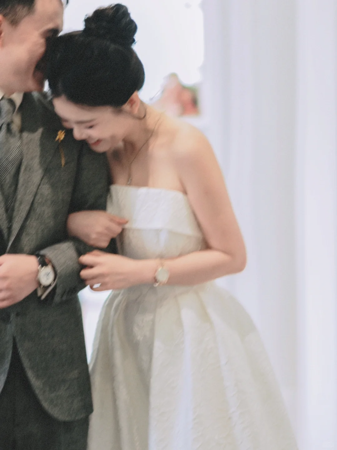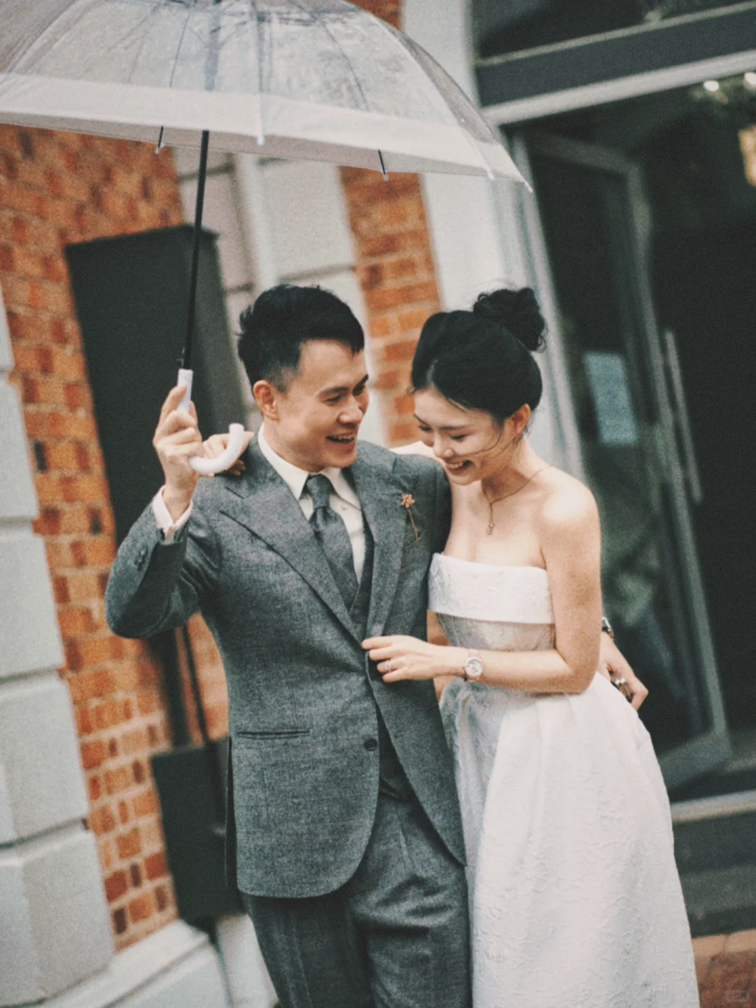 3⃣️结束后雨下大了,奶奶递给我们一把透明雨伞,丈夫撑着伞,护着我的肩,摄影师在门前拍下了我最喜欢的一张照片。下雨天,你撑伞,接我回家,感觉真好呀。