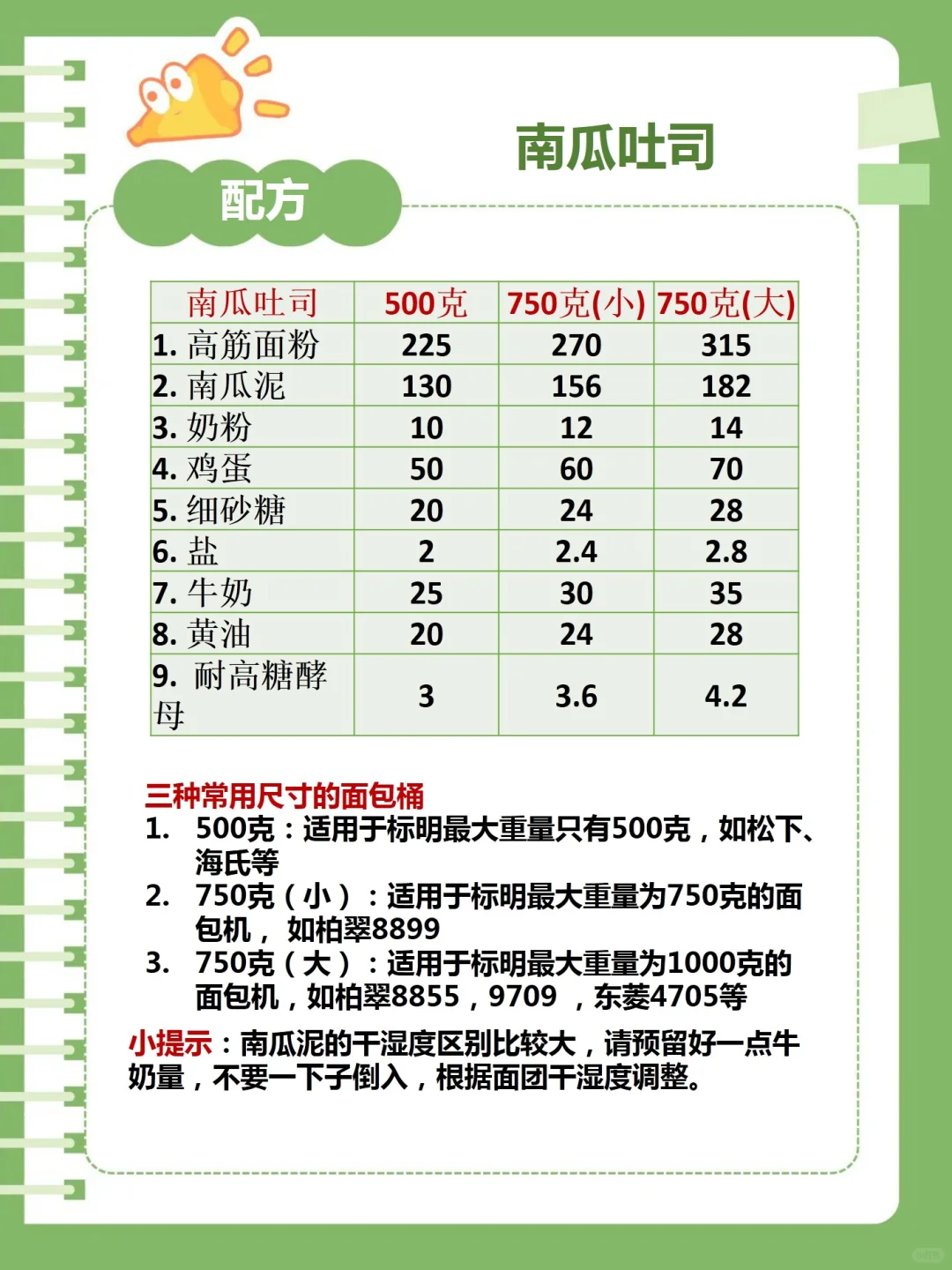 各种大小的面包桶的配方如图所示,为了迎合健康的需求,已经在四年前的配方基础上减糖了。实践证明不影响面包发酵,因为这南瓜简直就是爆顶神器!千万别再加量,会铺出来的!