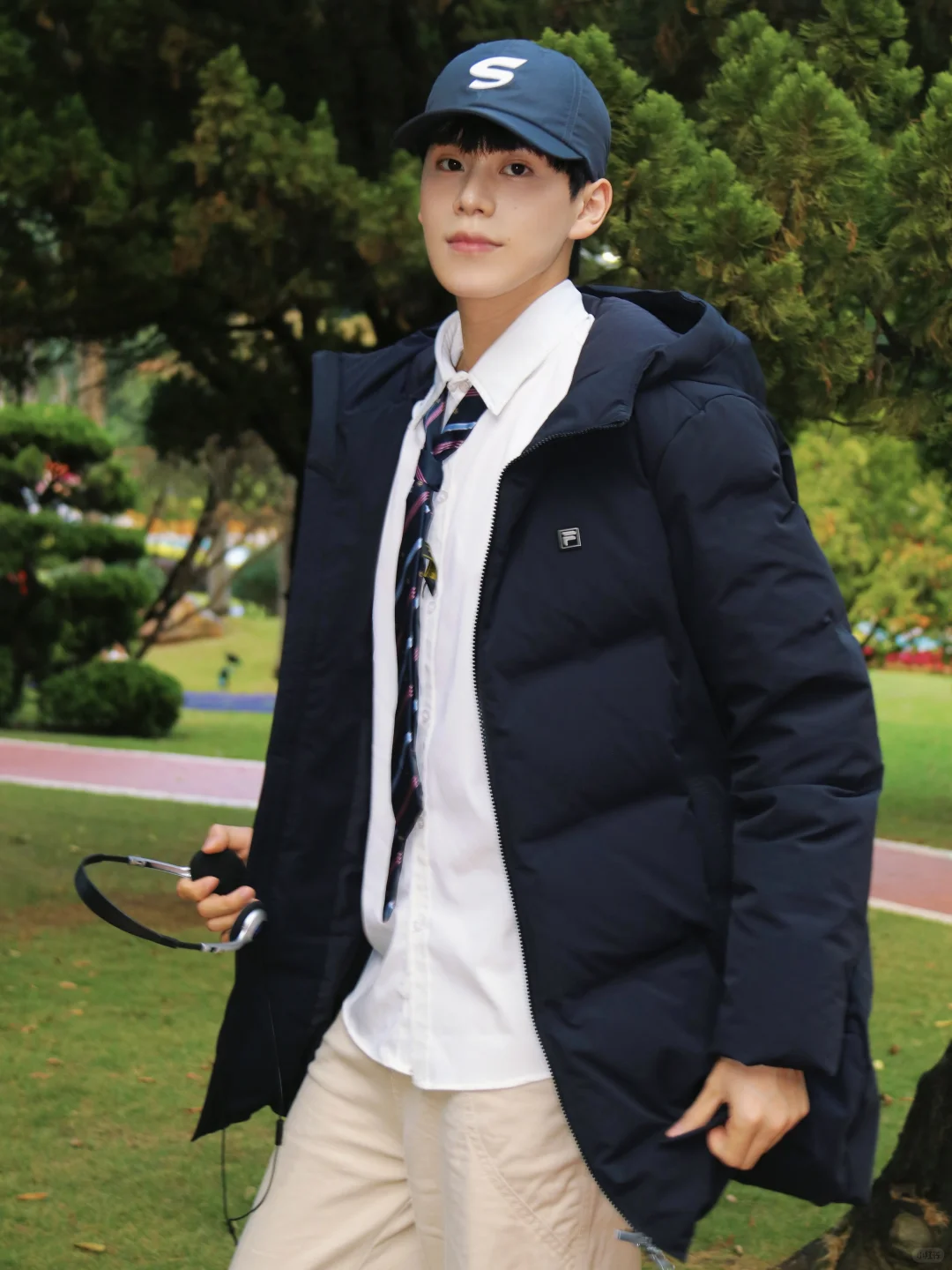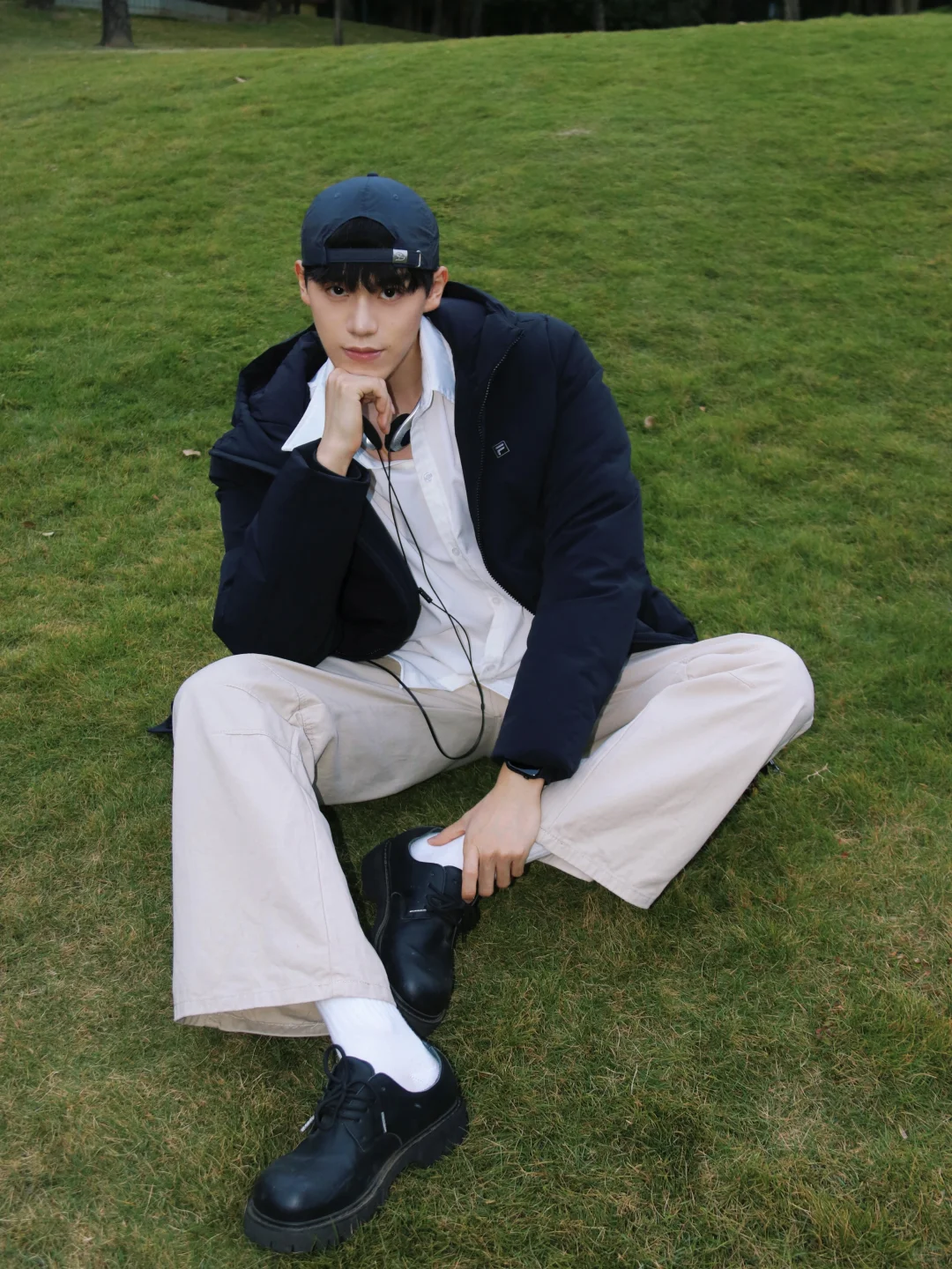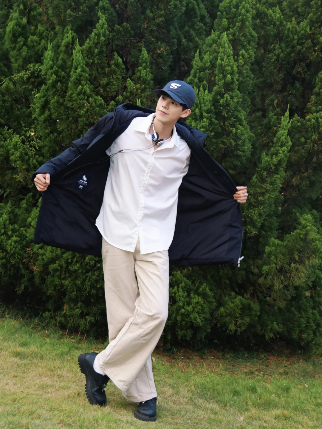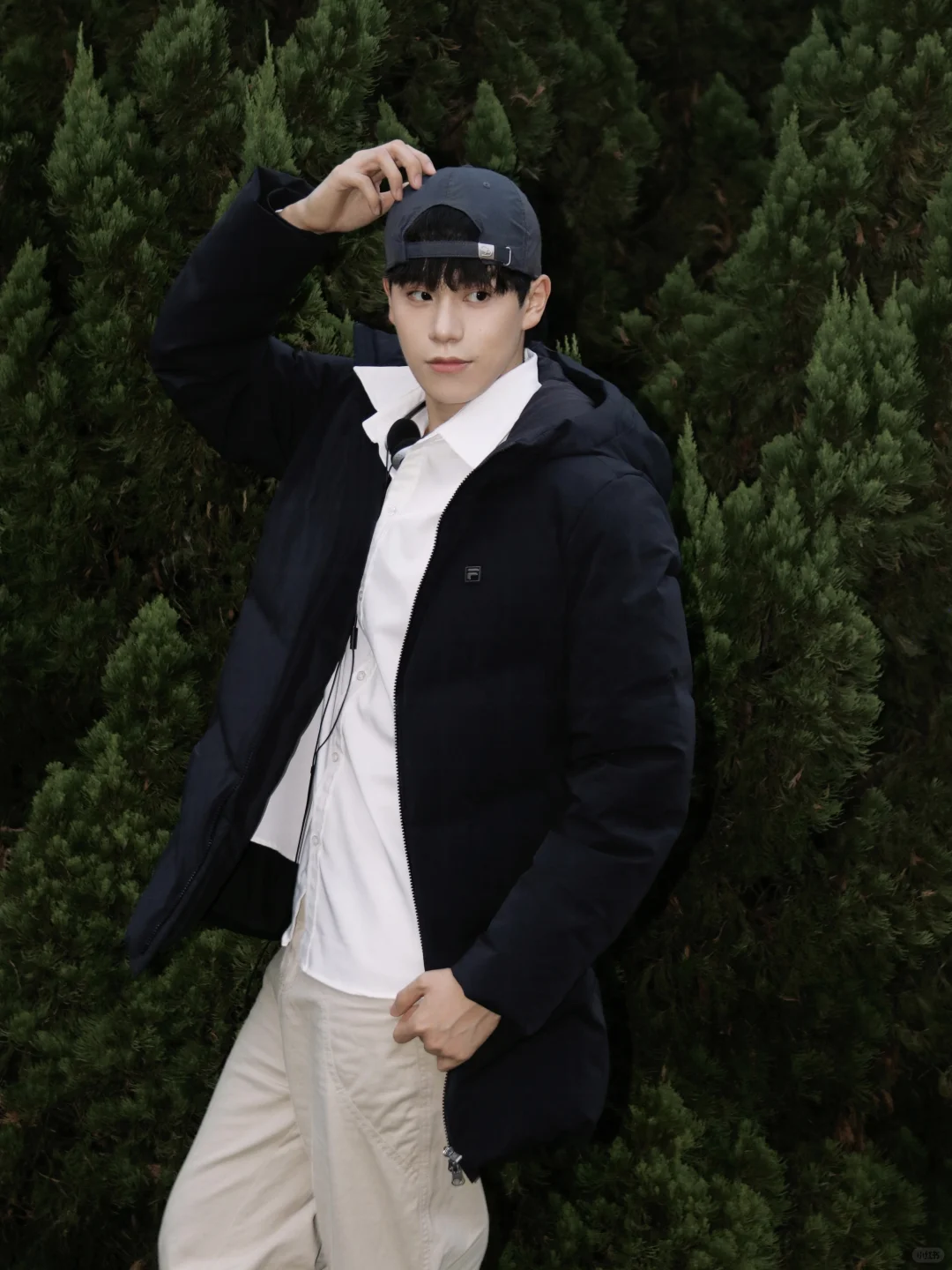 白衬衫+休闲裤+FILA高质VC羽绒,