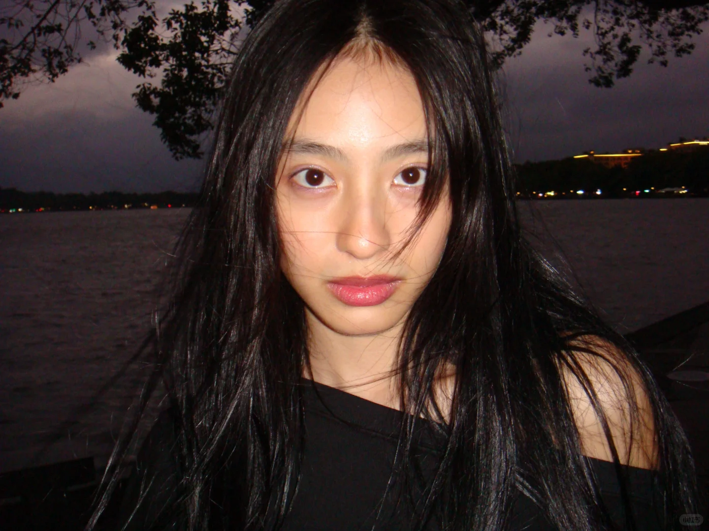 竖条纹旗袍的开叉恰到好处,衬得腿型修长,线条舒展而柔和;肤色均匀且细腻,姿态优雅